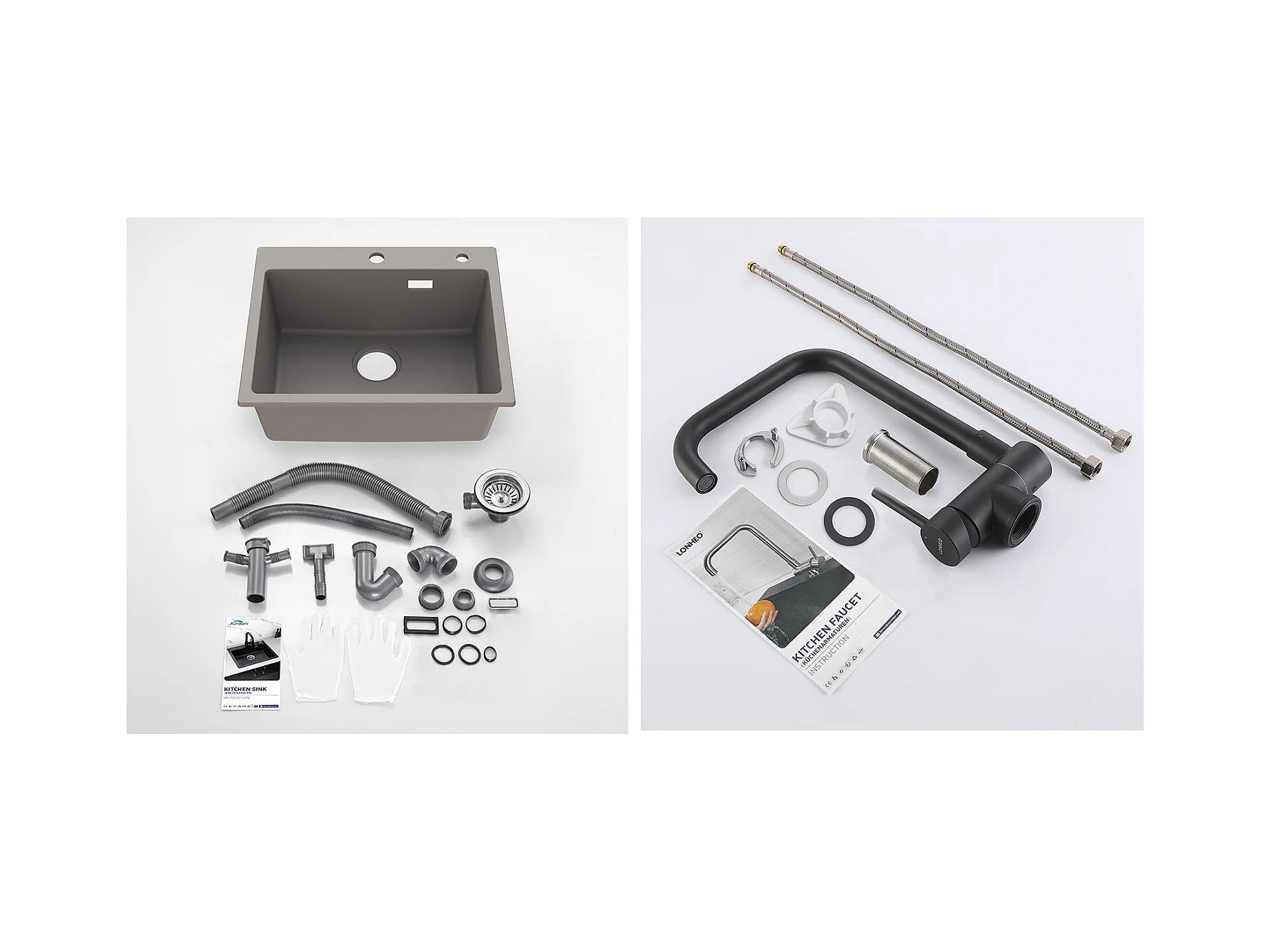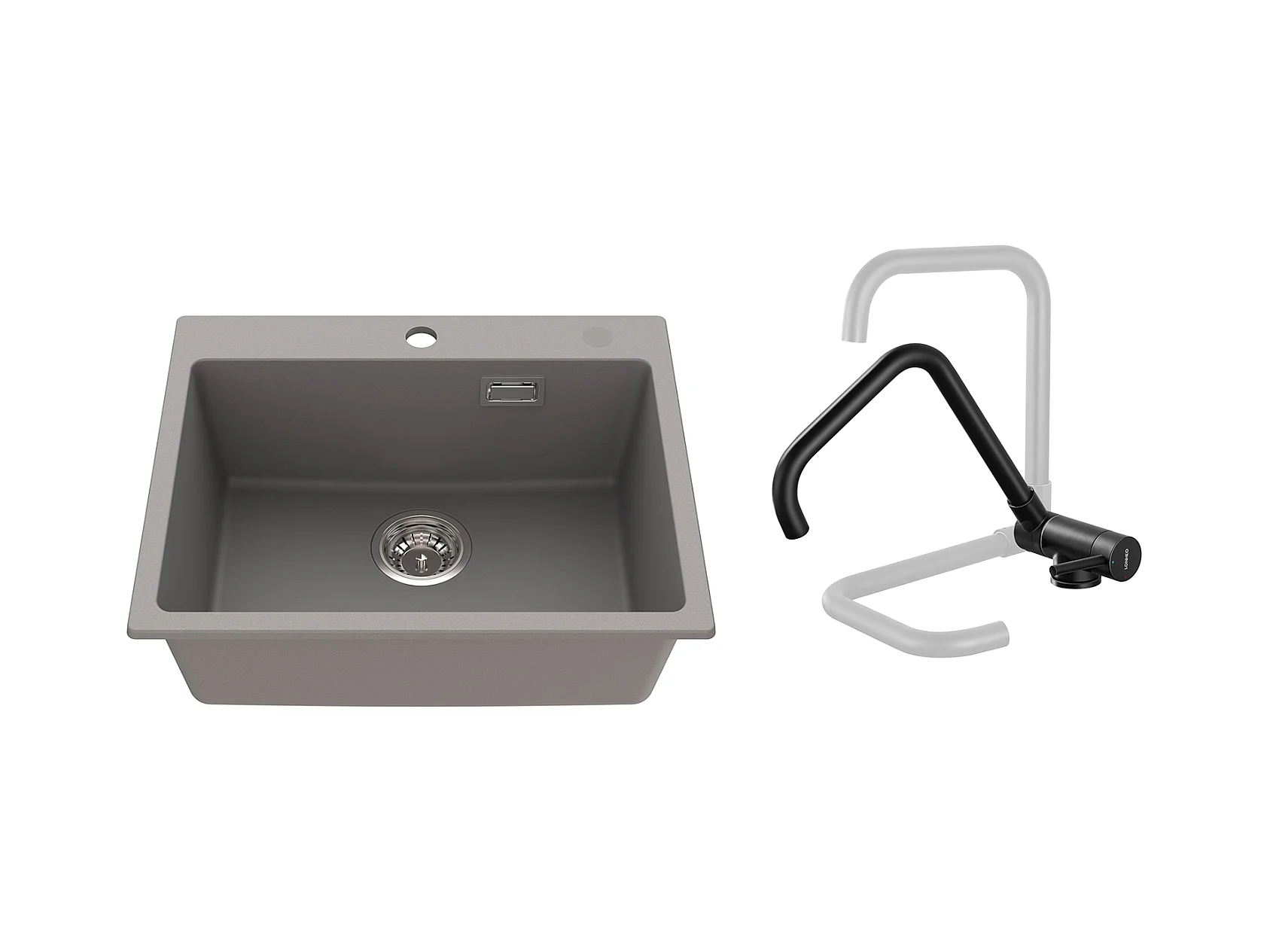 1 Bac Évier Cuisine en Granit,55*45*20cm,Kit de Vidage,Gris+Mitigeur Cuisine Rabattable Pivotant 360° Eau froid Chaud,Noir