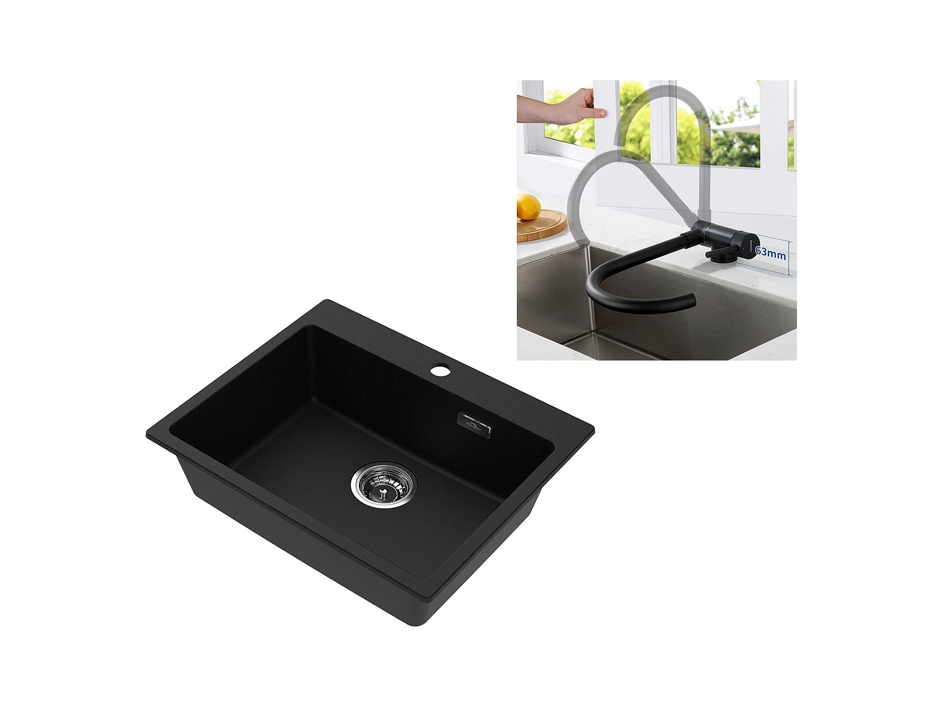 1 Bac Évier Cuisine en Granit,55*45*20cm,Kit de Vidage,Noir+ Robinet de Cuisine Chromé Pivotant à 360° Eau Froide /Chaude