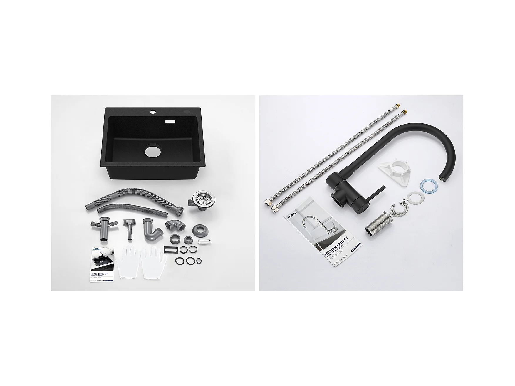 1 Bac Évier Cuisine en Granit,55*45*20cm,Kit de Vidage,Noir+Robinet de Cuisine Flexible Bec Haut Orientable Librement ,Blanc