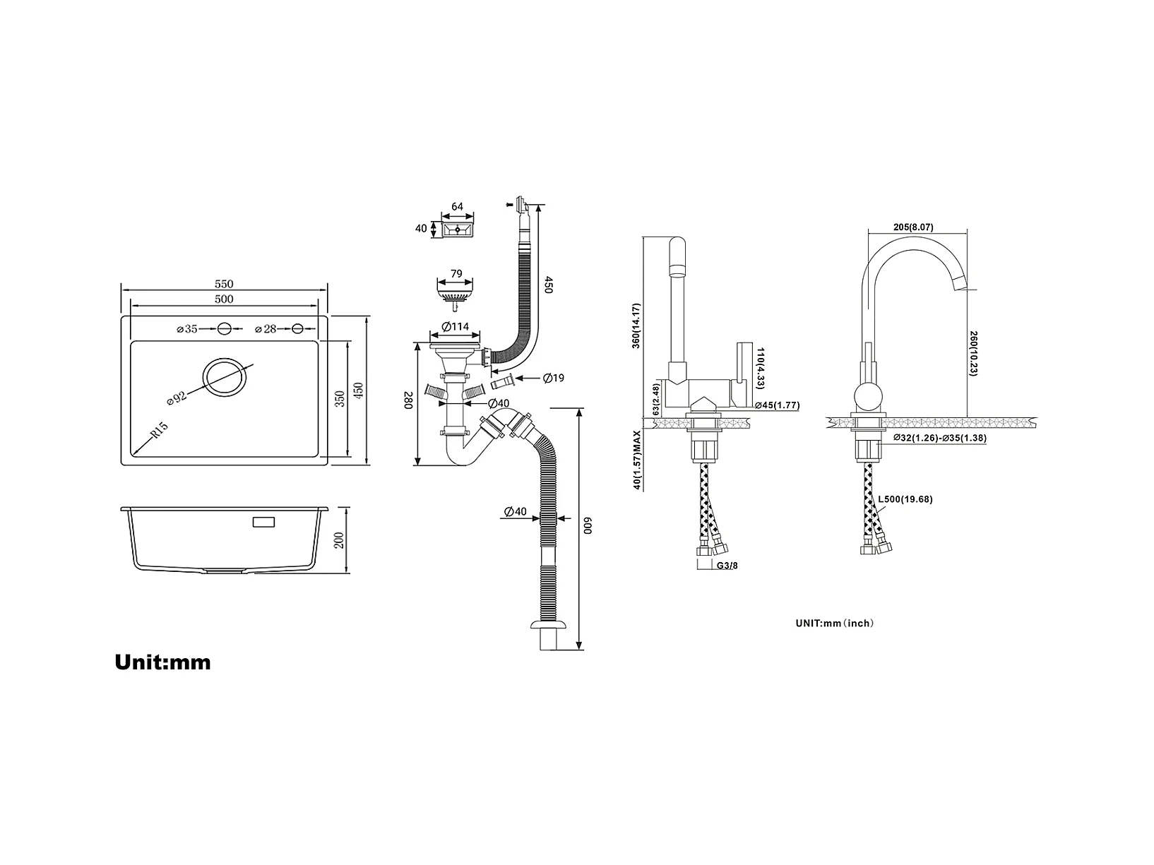 Évier Cuisine 1 Bac,en Granit,55*45*20cm,Kit de Vidage,Évier Cuisine Encastré,Trous de Montage pour Robinet/Distributeur Savon,Noir,EU Modèle