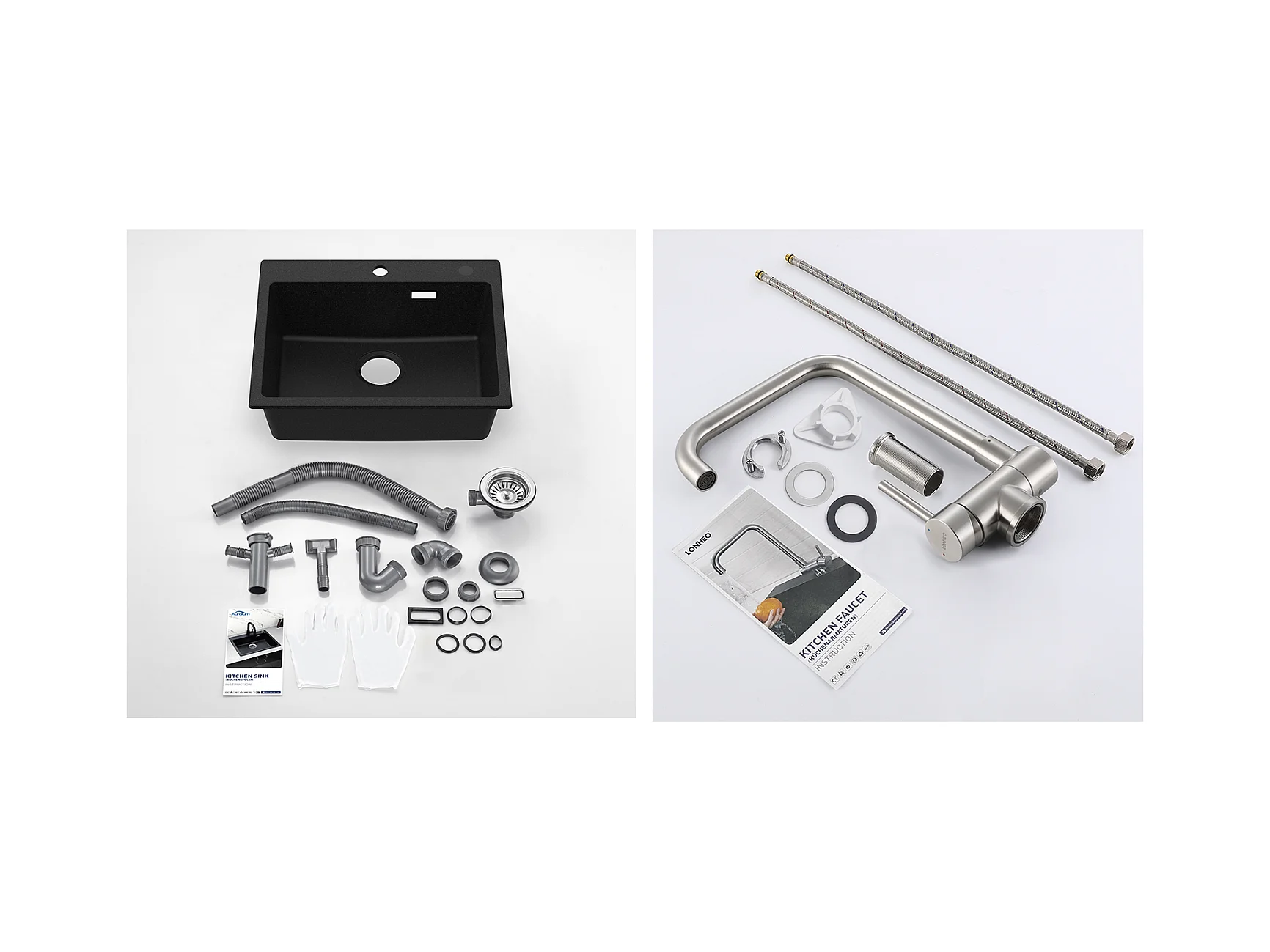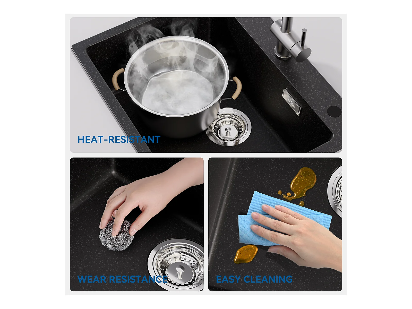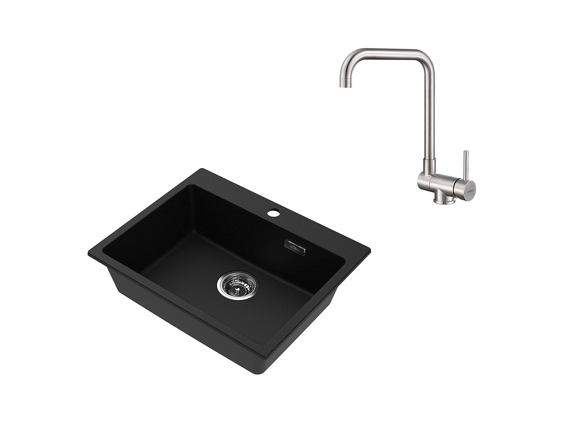 1 Bac Évier Cuisine en Granit,55*45*20cm,Kit de Vidage,Noir+Robinet Cuisine,Orientable 360°,Eau Chaude/Froide,Noir