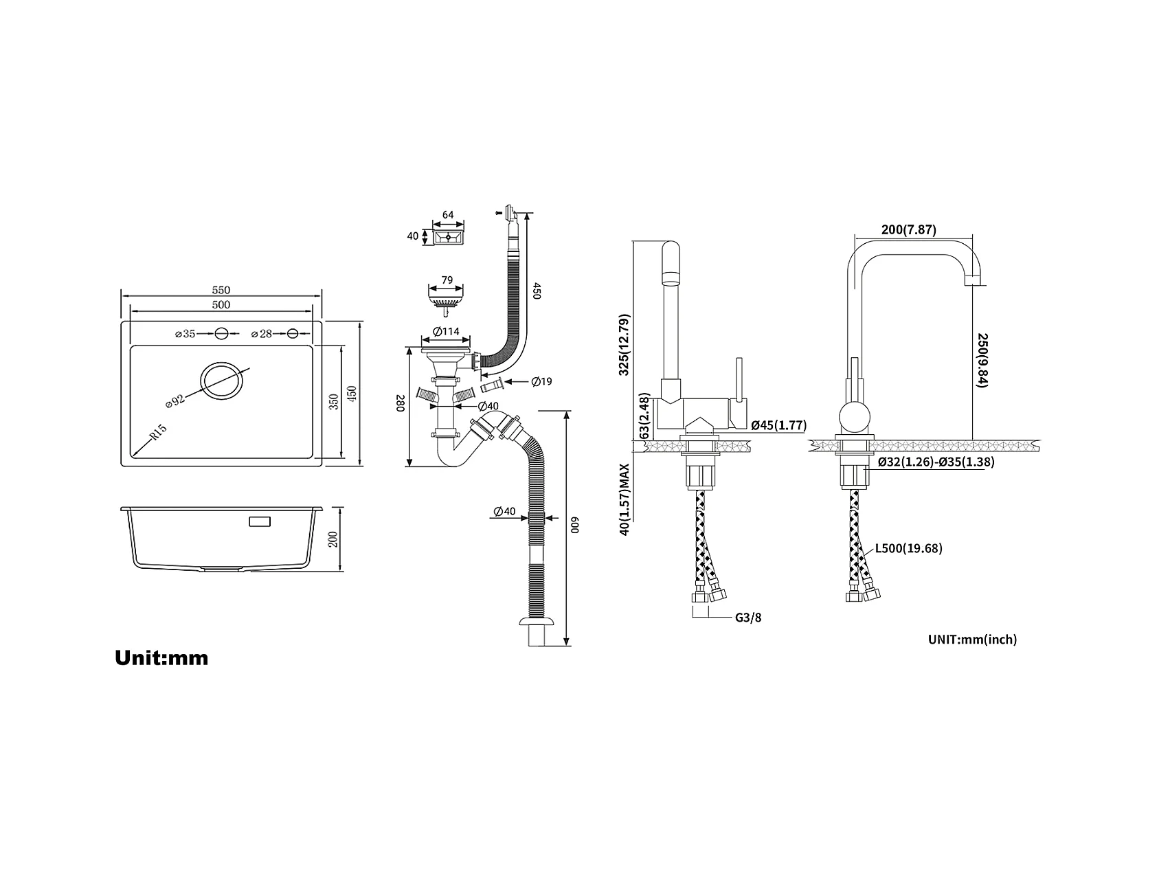 Évier Cuisine 1 Bac,en Granit,55*45*20cm,Kit de Vidage,Évier Cuisine Encastré,Trous de Montage pour Robinet/Distributeur Savon,Noir,EU Modèle