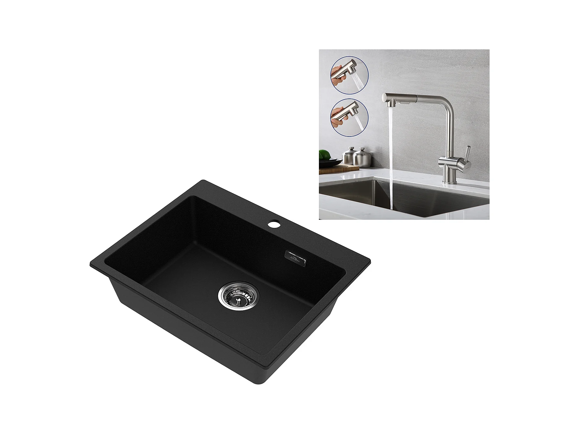 1 Bac Évier Cuisine en Granit,55*45*20cm,Kit de Vidage, Noir + Robinet de Cuisine Inox Extractible Rotatif à 360 °
