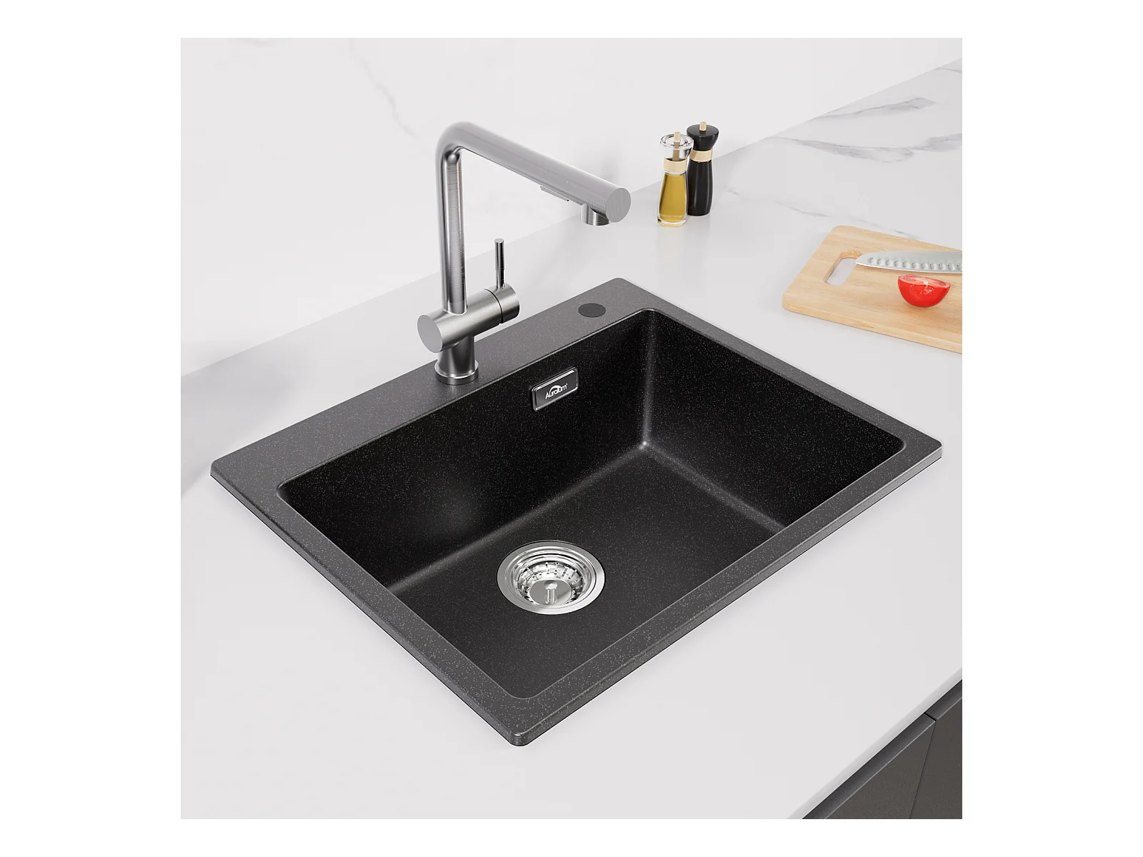 AuraLum Max 1 Bac Évier Cuisine en Granit,55*45*20cm,Kit de Vidage,Noir+Robinet de Cuisine avec Douchette Extractible Rotatif 360 °2 Fonct,EU Modèle