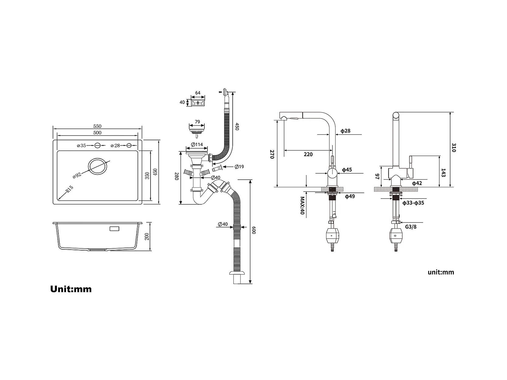 Évier Cuisine 1 Bac,en Granit,55*45*20cm,Kit de Vidage,Évier Cuisine Encastré,Trous de Montage pour Robinet/Distributeur Savon,Noir,EU Modèle