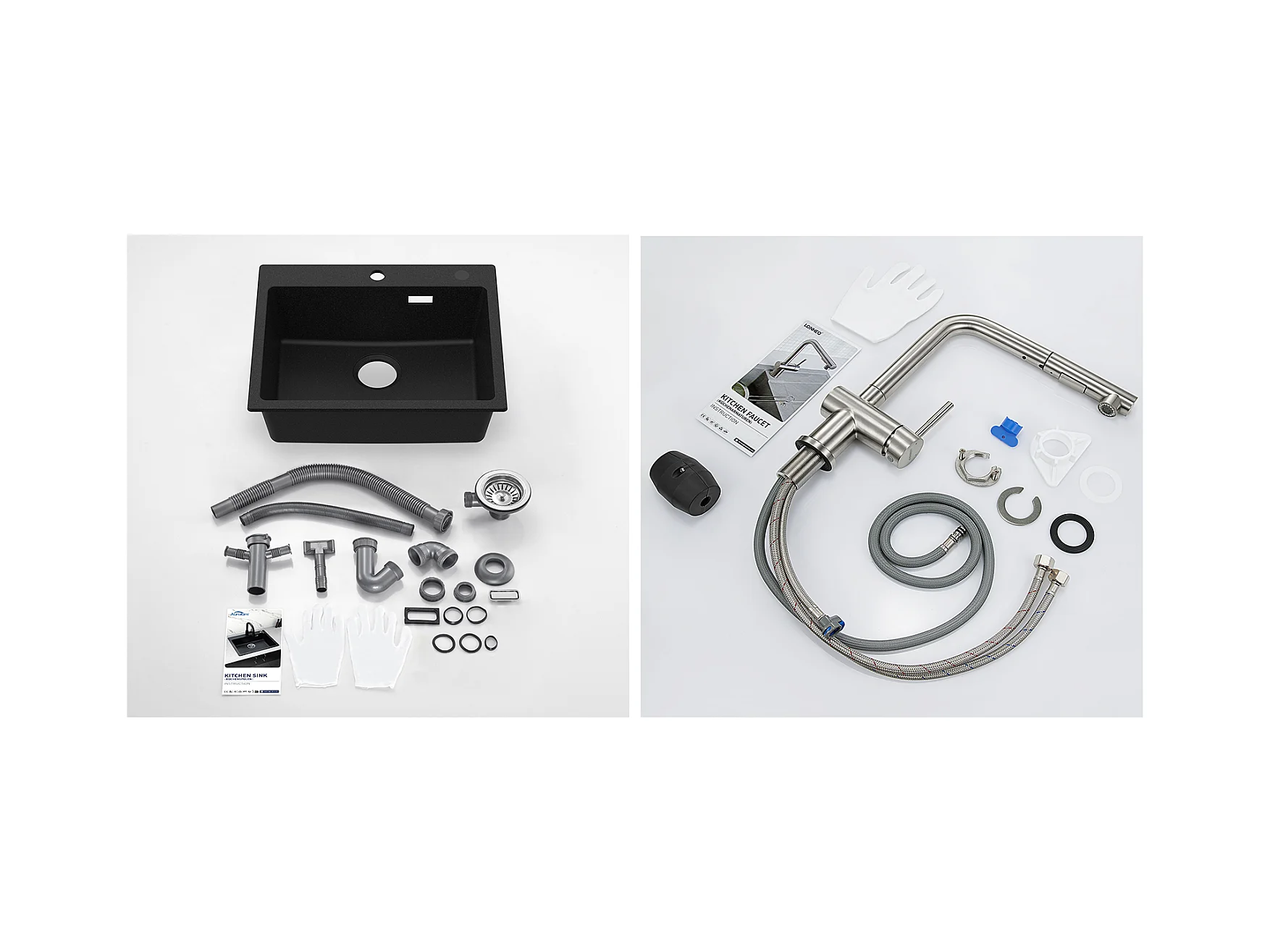1 Bac Évier Cuisine en Granit,55*45*20cm,Kit de Vidage,Noir+Robinet de Cuisine Flexible Bec Haut Orientable Librement ,Blanc