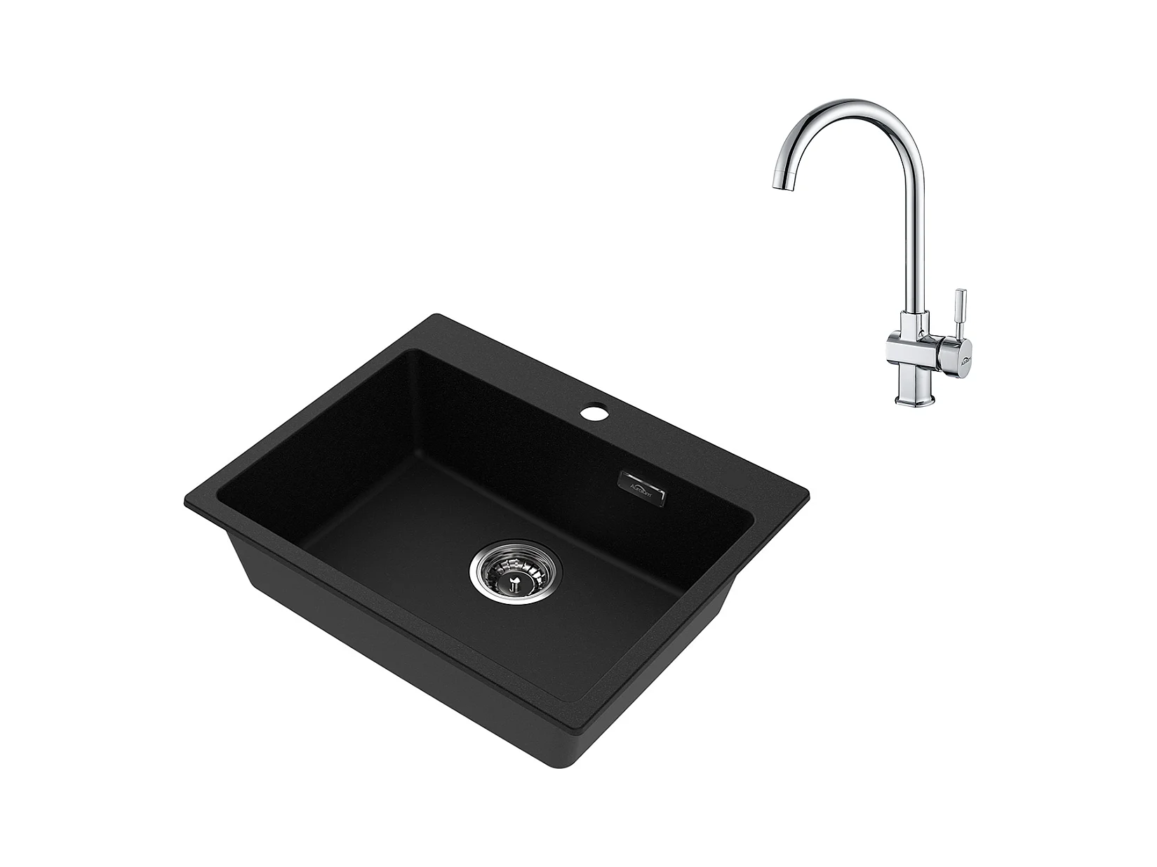 1 Bac Évier Cuisine en Granit,55*45*20cm,Kit de Vidage,Noir+ Robinet de Cuisine Chromé Pivotant à 360° Eau Froide /Chaude