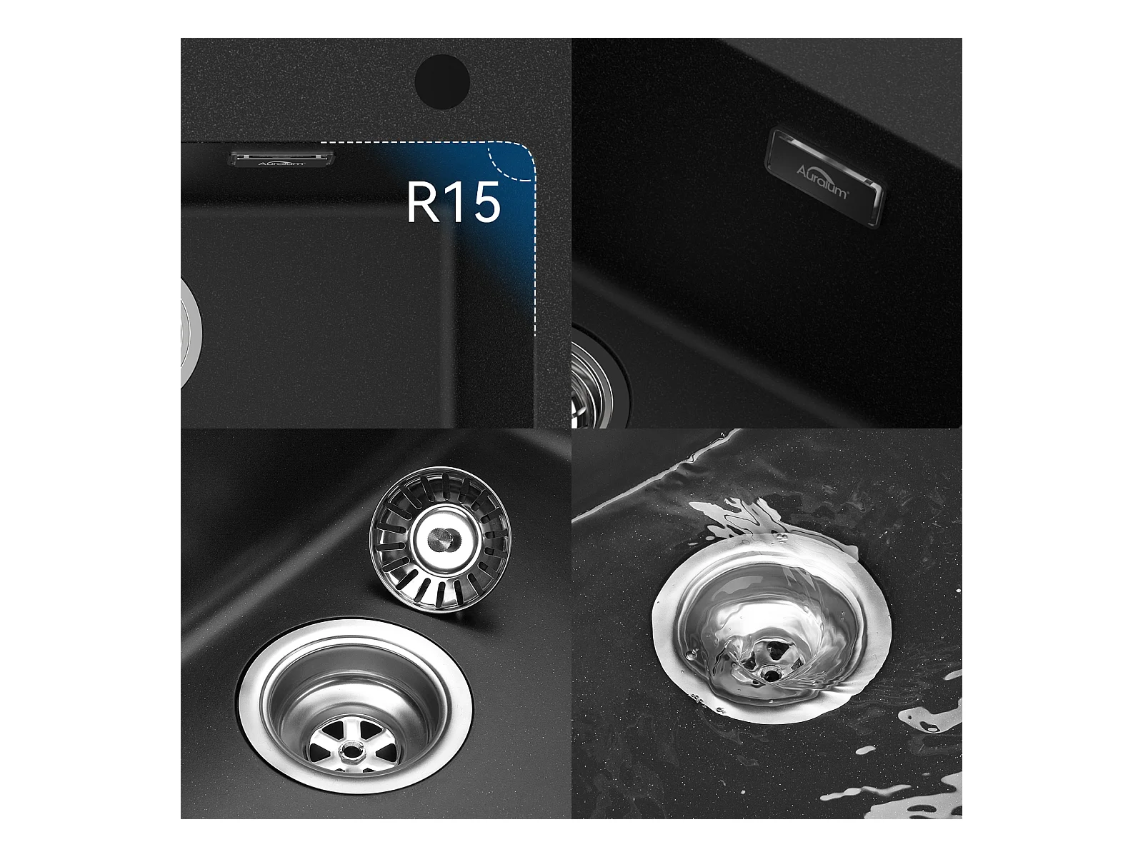 AuraLum Max 1 Bac Évier Cuisine en Granit,55*45*20cm,Kit de Vidage,Noir+Robinet de Cuisine avec Douchette Extractible Rotatif 360 °2 Fonct,EU Modèle