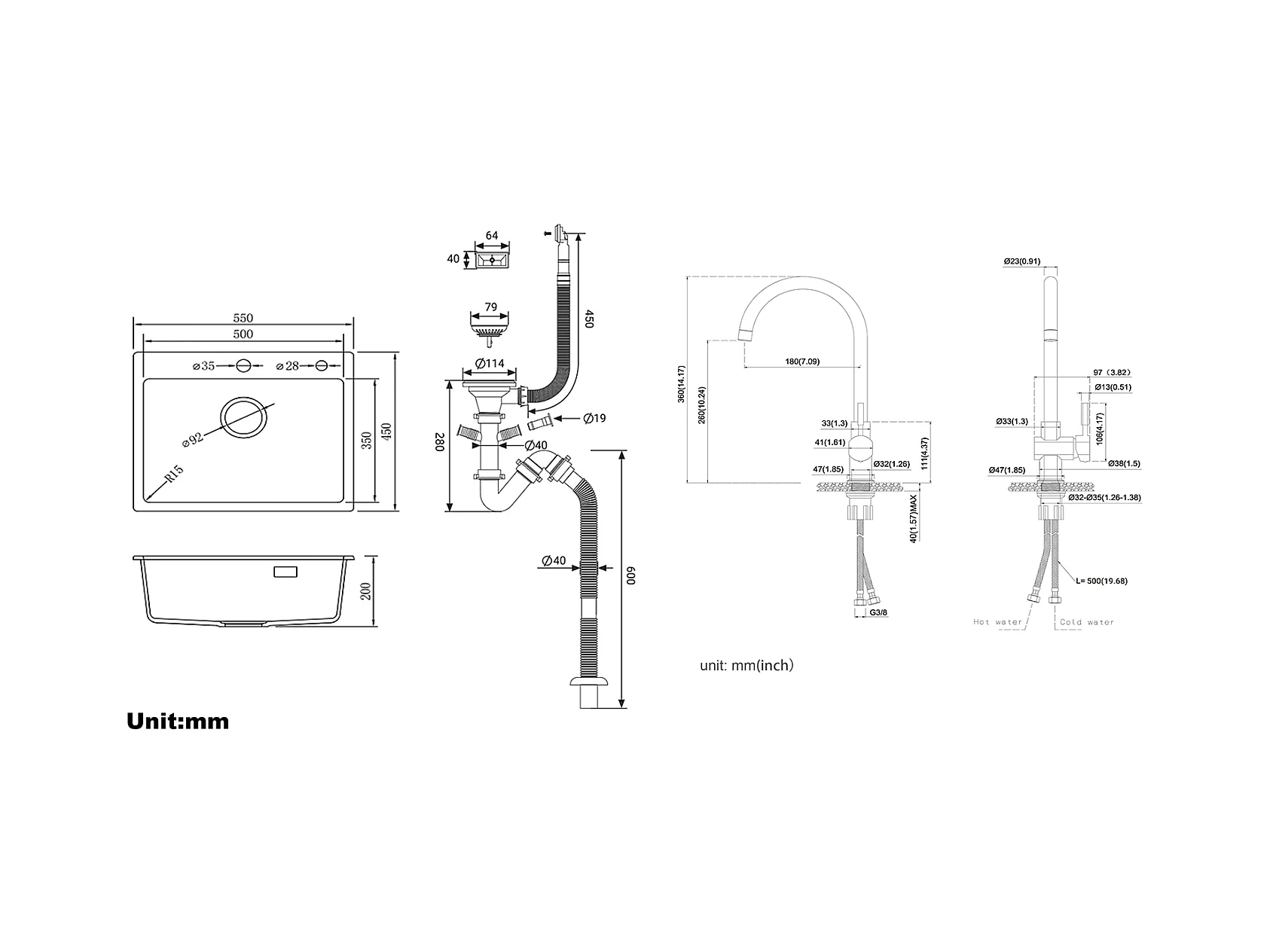 1 Bac Évier Cuisine en Granit,55*45*20cm,Kit de Vidage,Noir+Robinet Cuisine,Orientable 360°,Eau Chaude/Froide,Noir