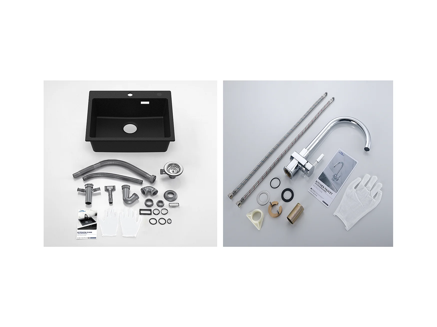 1 Bac Évier Cuisine en Granit,55*45*20cm,Kit de Vidage,Noir+Robinet de Cuisine Flexible Bec Haut Orientable Librement ,Blanc