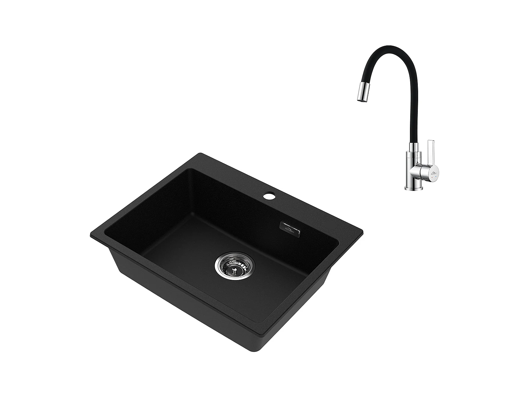 1 Bac Évier Cuisine en Granit,55*45*20cm,Kit de Vidage,Noir+Robinet de Cuisine Flexible Bec Haut Orientable