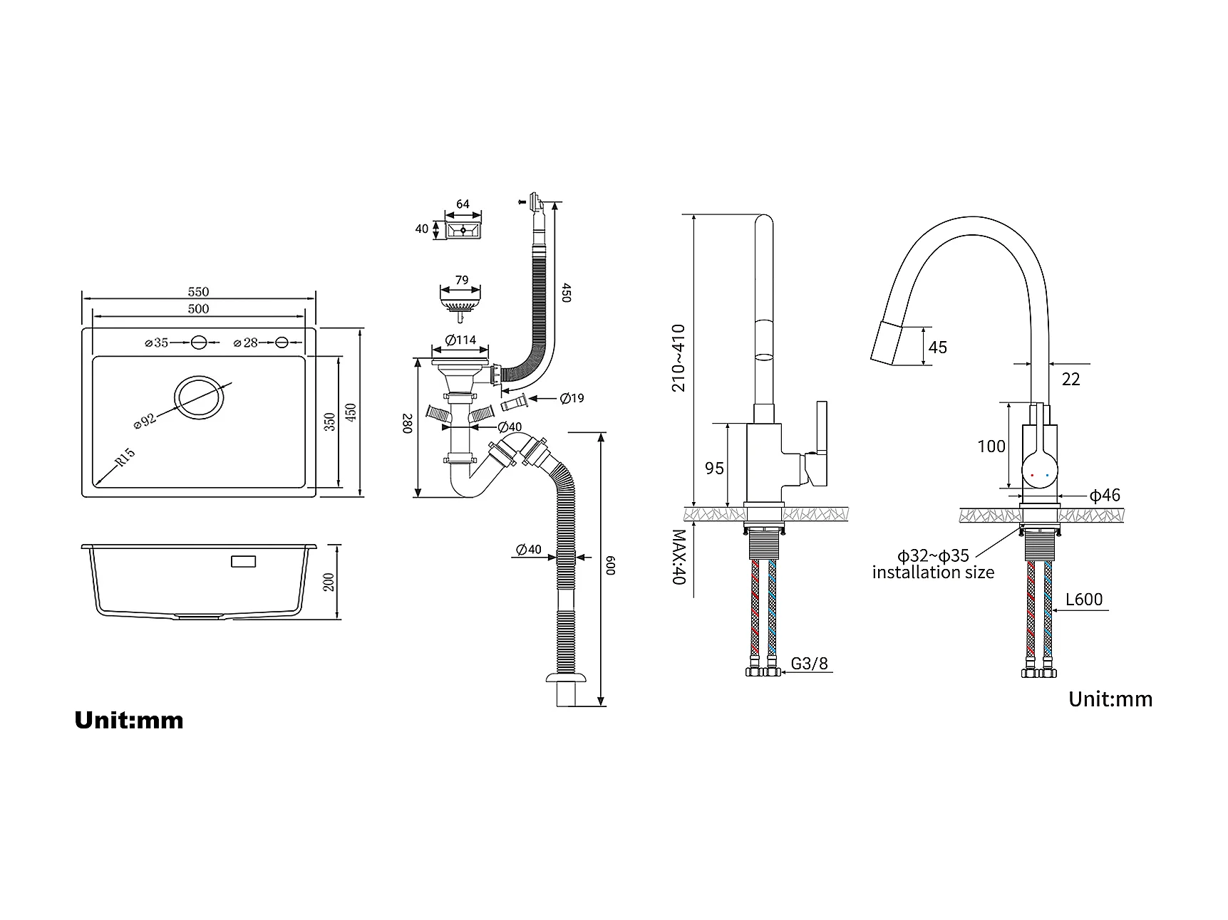 1 Bac Évier Cuisine en Granit,55*45*20cm,Kit de Vidage,Noir+Mitigeur Cuisine Rabattable Pivotant 360° Eau froid Chaud