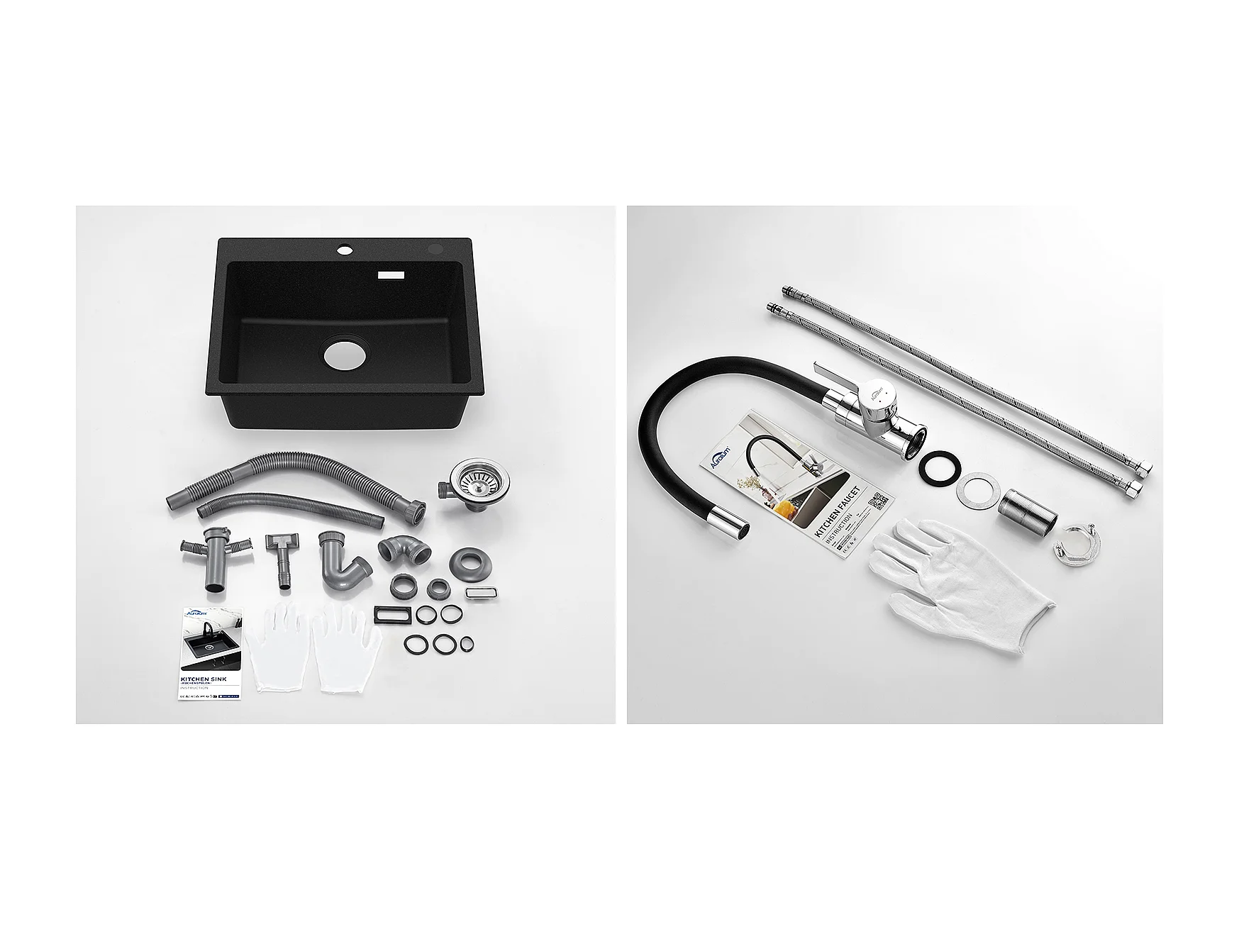 1 Bac Évier Cuisine en Granit,55*45*20cm,Kit de Vidage,Noir+Robinet Cuisine,Orientable 360°,Eau Chaude/Froide,Noir