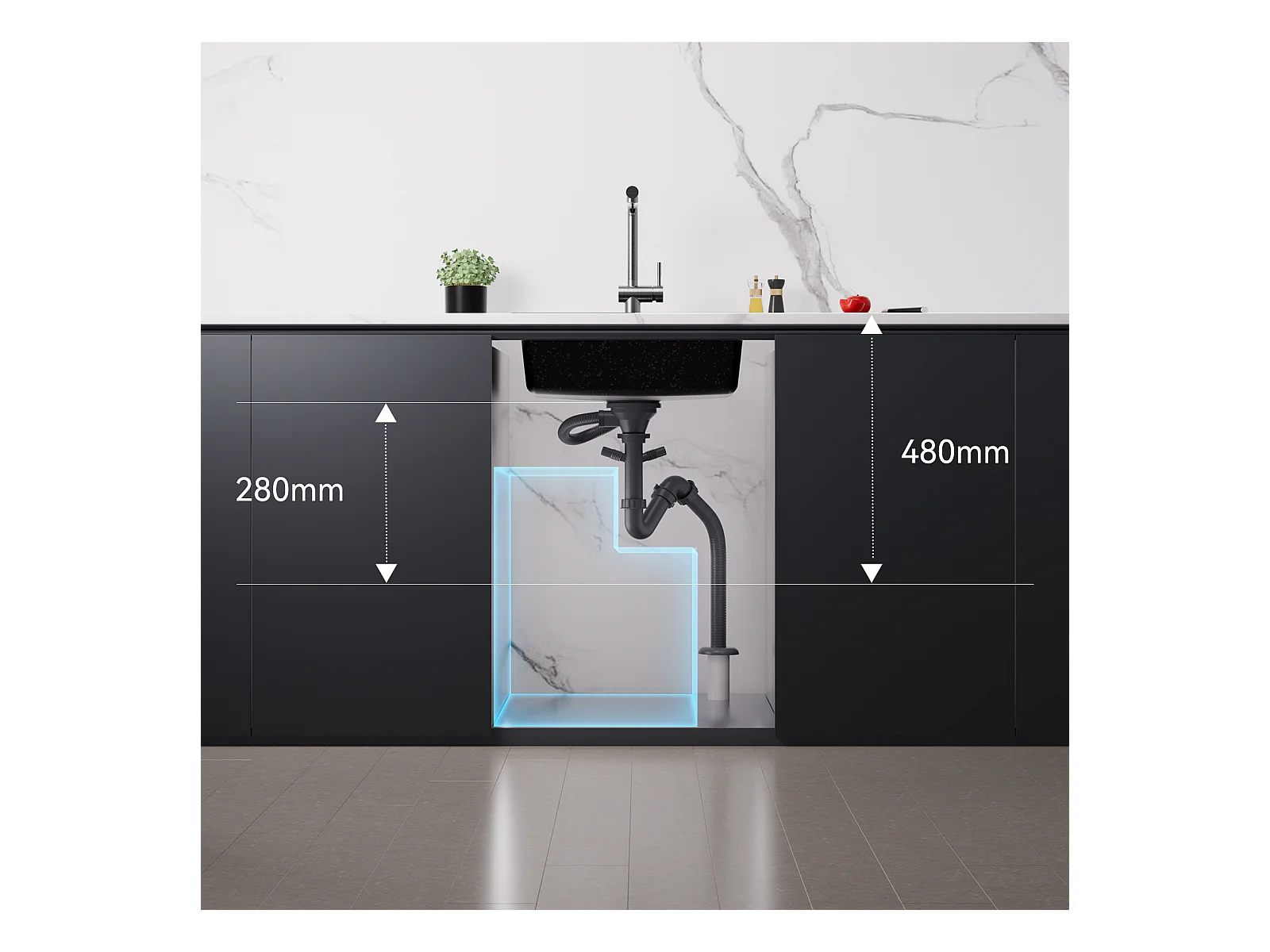 1 Bac Évier Cuisine en Granit,55*45*20cm,Kit de Vidage,Noir+Robinet de Cuisine Flexible Bec Haut Orientable Librement ,Blanc