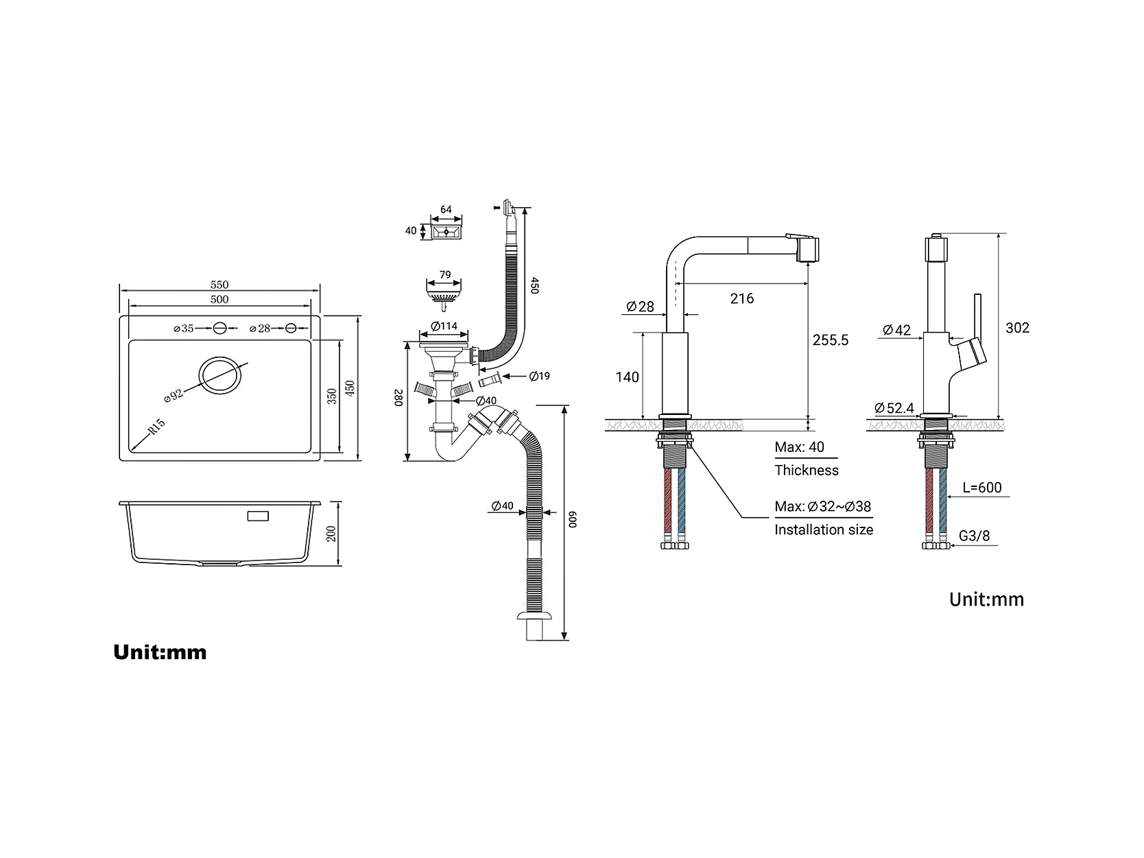 Évier Cuisine 1 Bac,en Granit,55*45*20cm,Kit de Vidage,Évier Cuisine Encastré,Trous de Montage pour Robinet/Distributeur Savon,Noir,EU Modèle