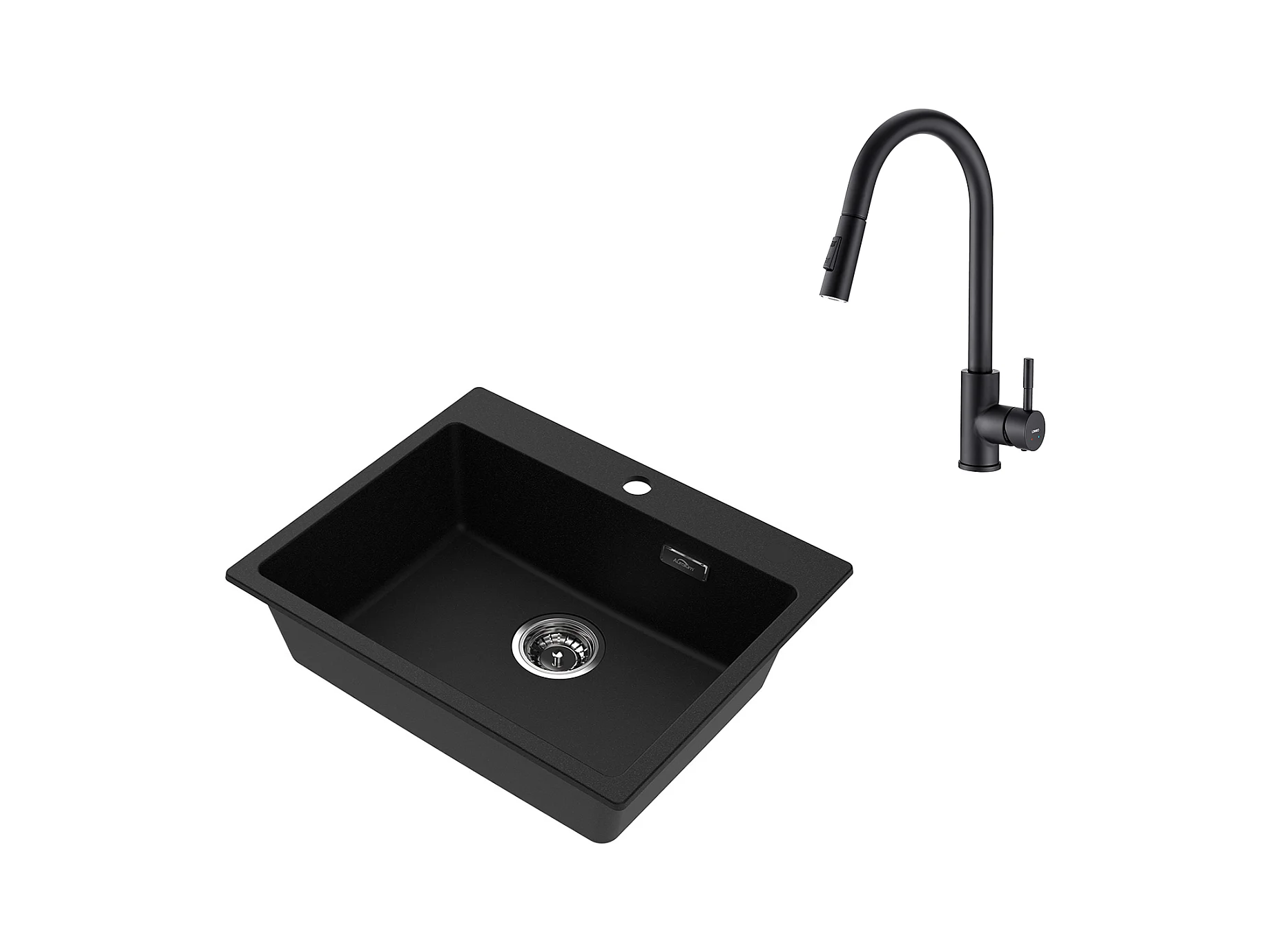 1 Bac Évier Cuisine en Granit,55*45*20cm,Kit de Vidage, Noir + Robinet de Cuisine Inox Extractible Rotatif à 360 °