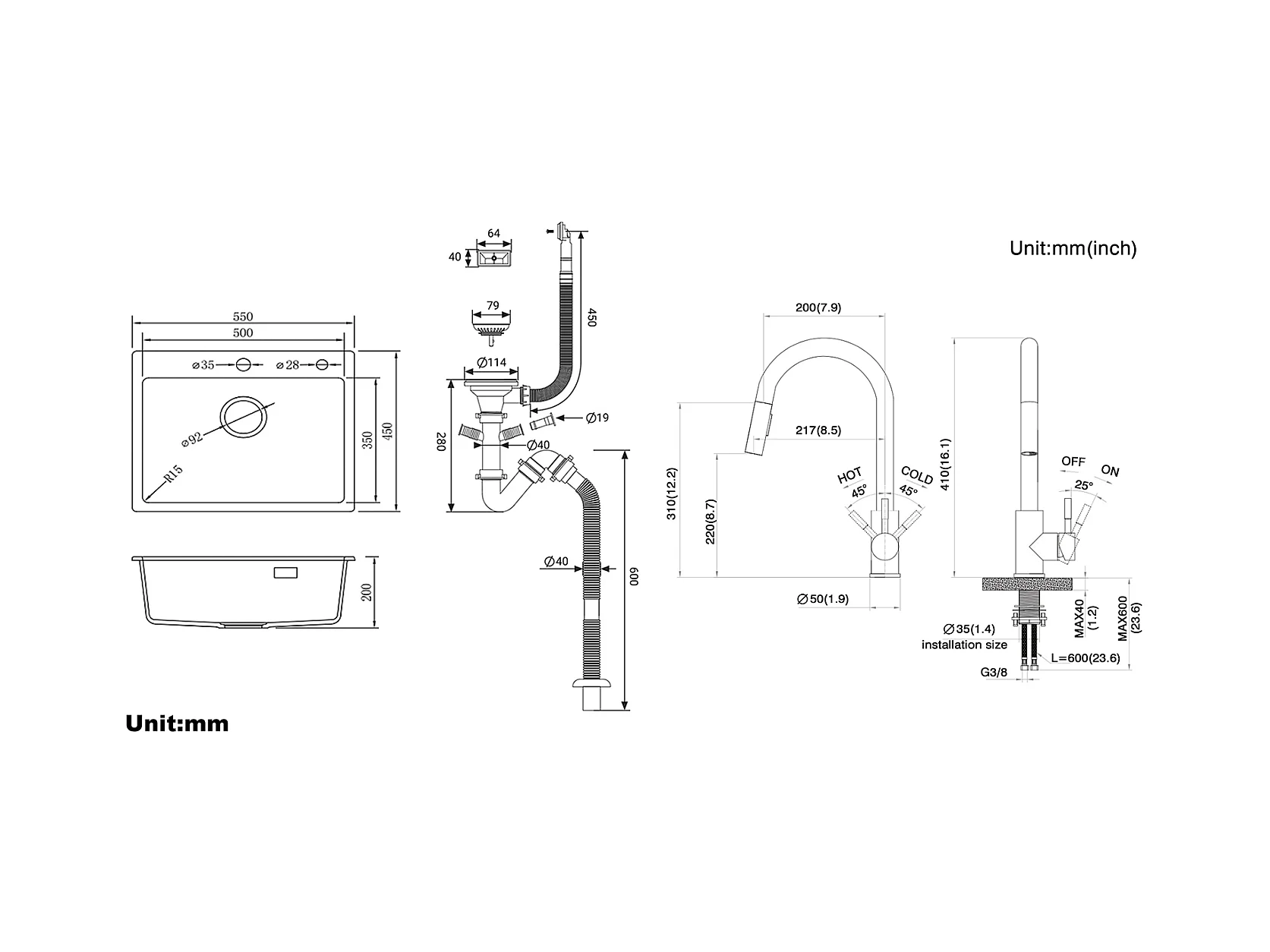 Évier Cuisine 1 Bac,en Granit,55*45*20cm,Kit de Vidage,Évier Cuisine Encastré,Trous de Montage pour Robinet/Distributeur Savon,Noir,EU Modèle