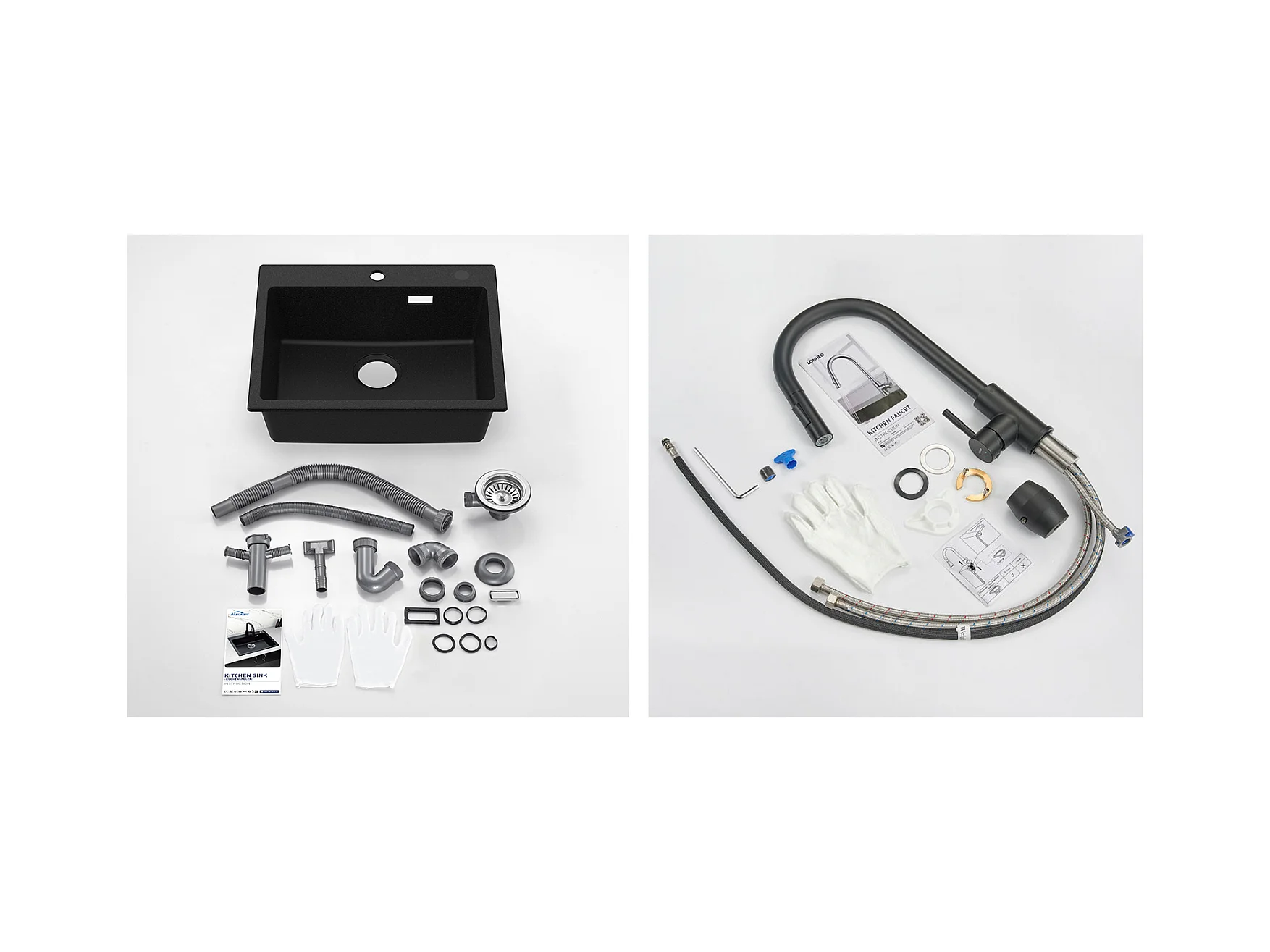 1 Bac Évier Cuisine en Granit,55*45*20cm,Kit de Vidage,Noir+Robinet de Cuisine Flexible Bec Haut Orientable Librement ,Blanc