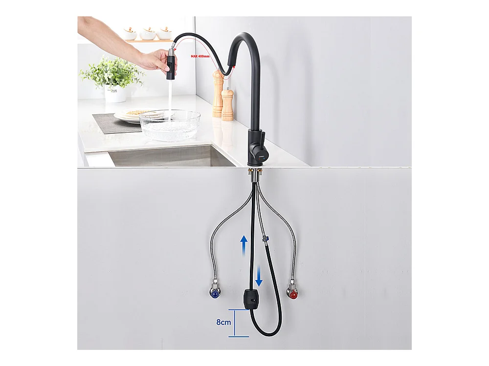 Robinet Cuisine Flexible Robinet avec 2 Types de Jets, Mitigeur Cuisine Rabattable, Flexible Mitigeur Evier avec Eau Chaude et Froide - Noir + Brossé