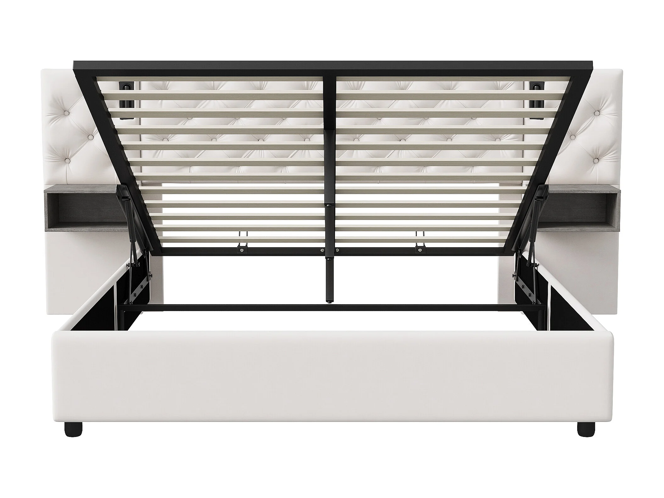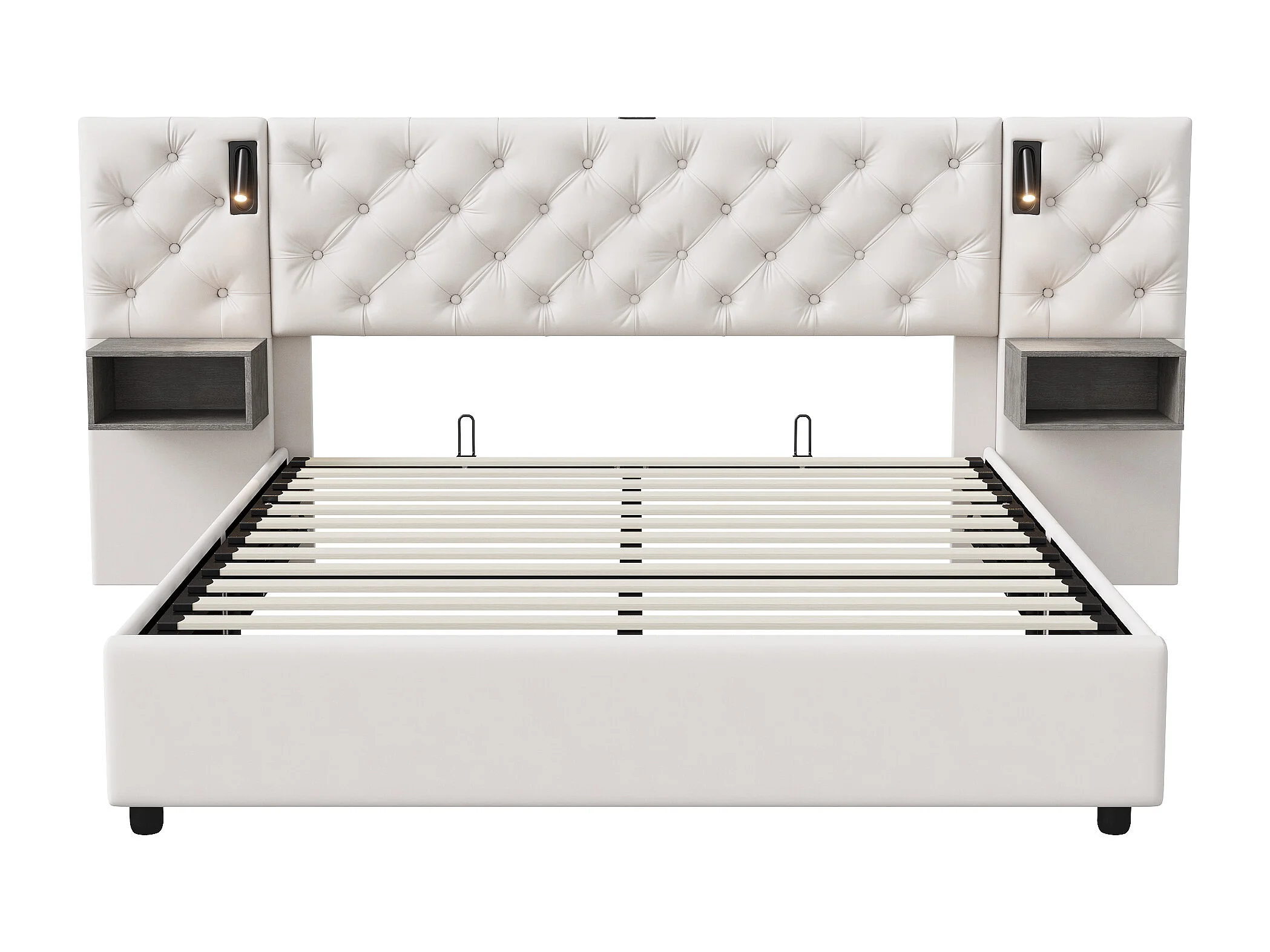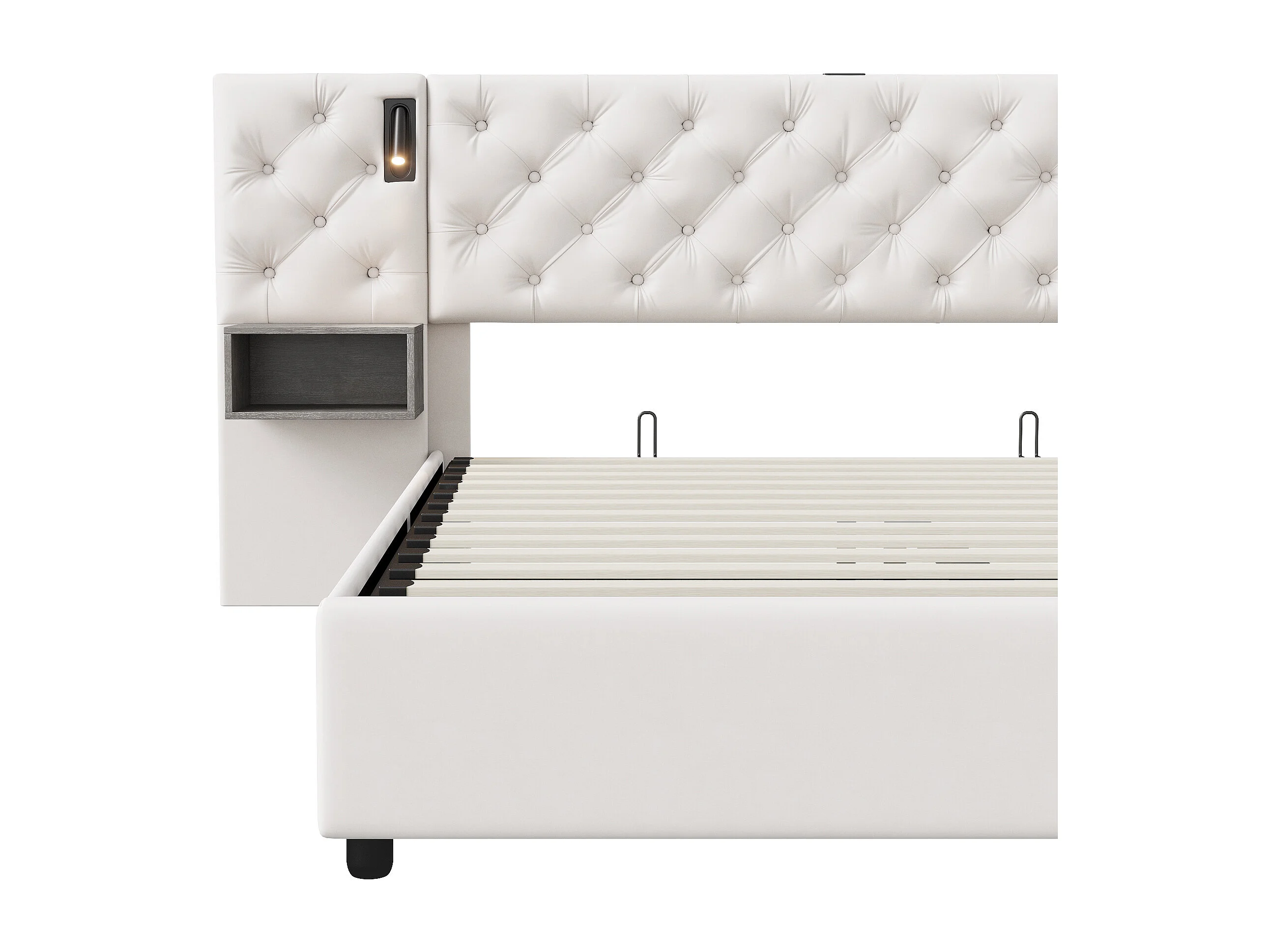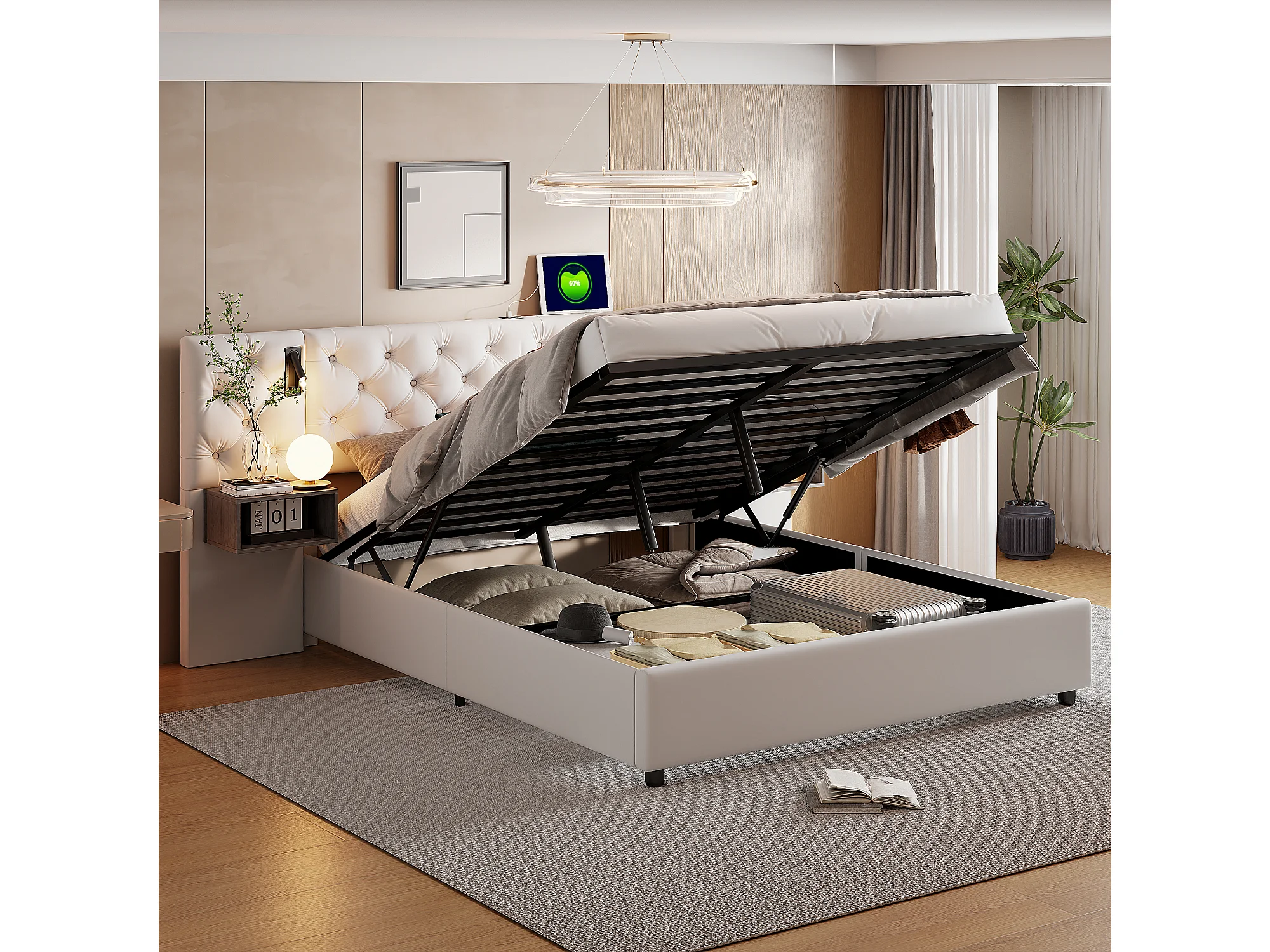 Lit Coffre avec Têtes de Rembourrées et 2 Niches de Rangement,USB et Type-C, avec sommier à Lattes, Velours, Beige, 140x200 cm