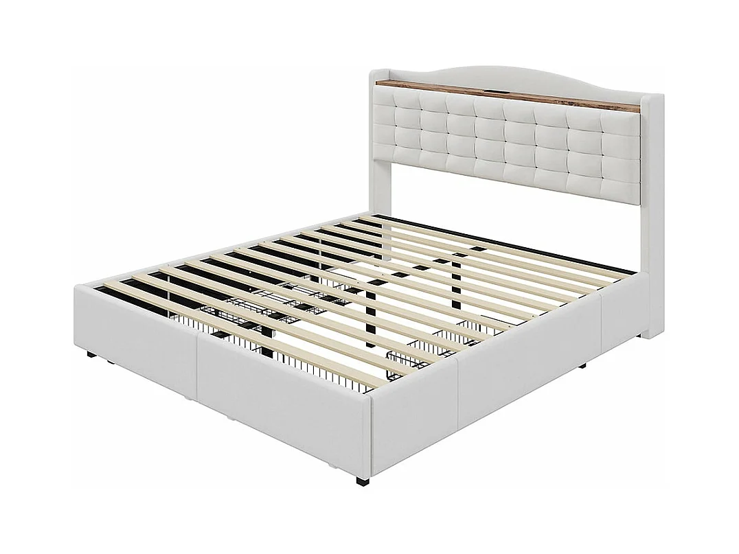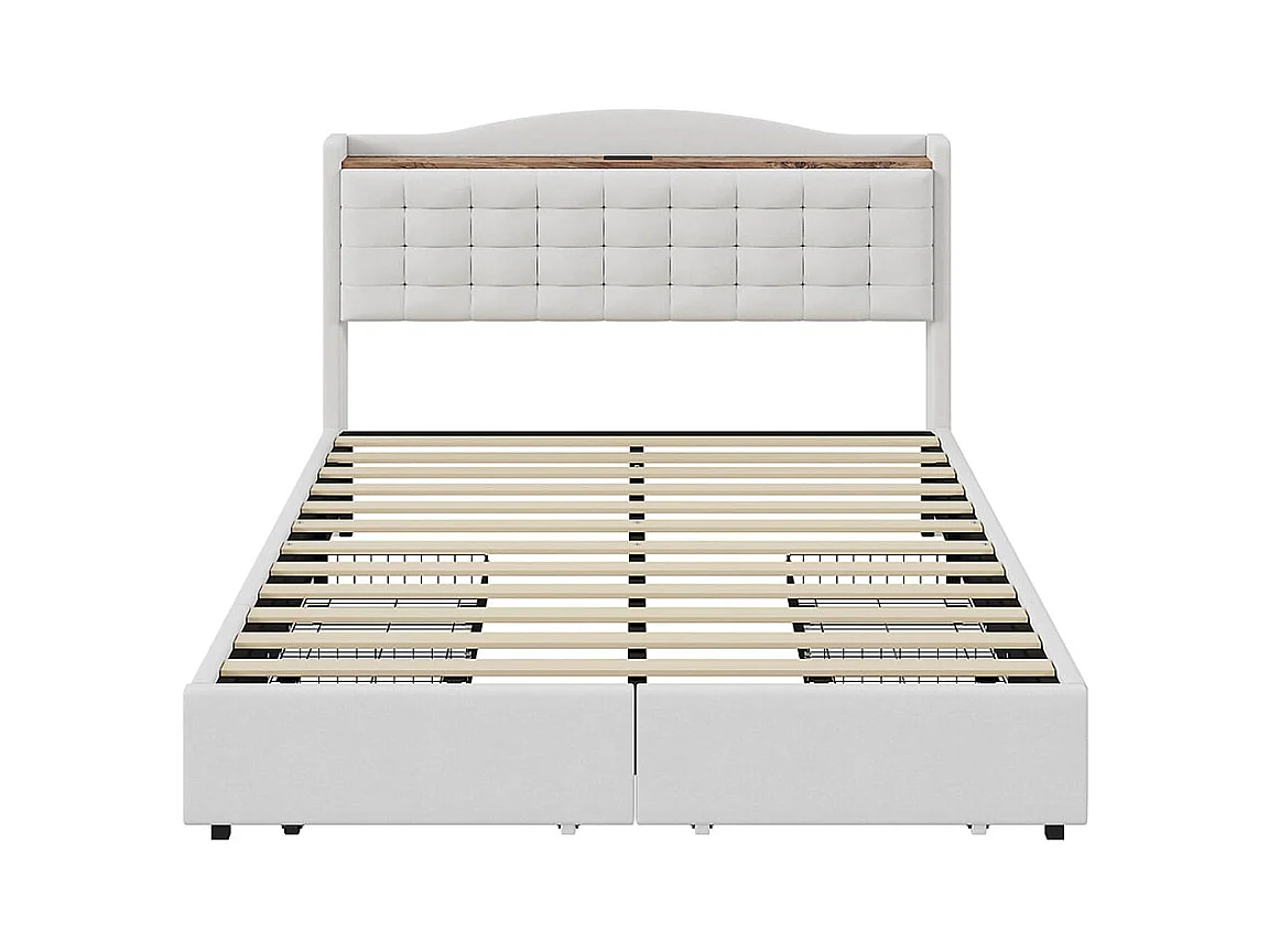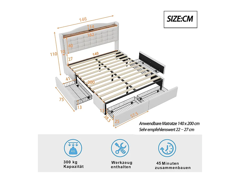 140*200 cm lit double capitonné, table de chevet avec port de charge USB et étagère, 4 tiroirs, tissu de lin beige