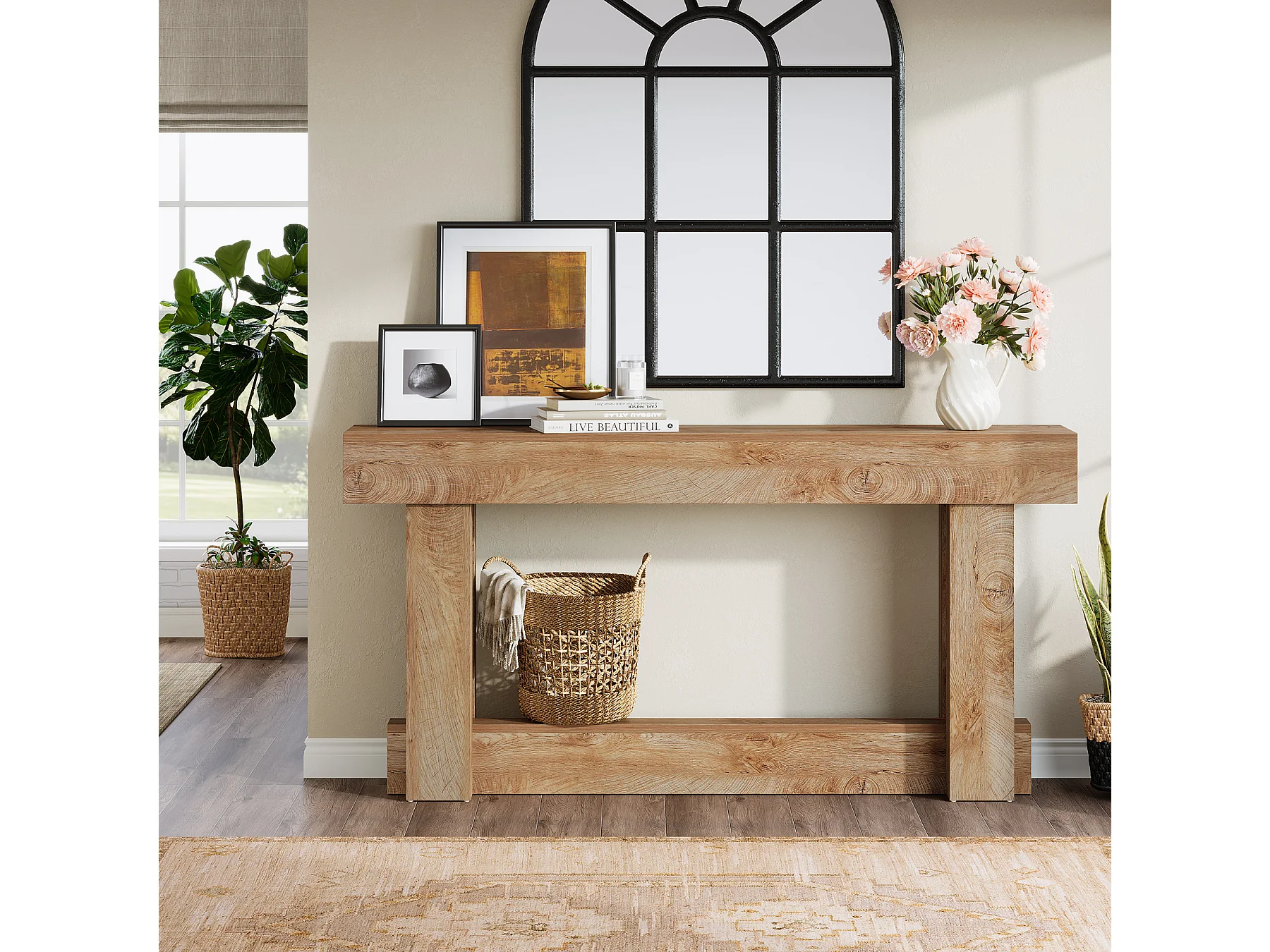 160cm Table Console, Table d'entrée à 2 étages, d'appoint rectangulaire en Bois derrière Le canapé