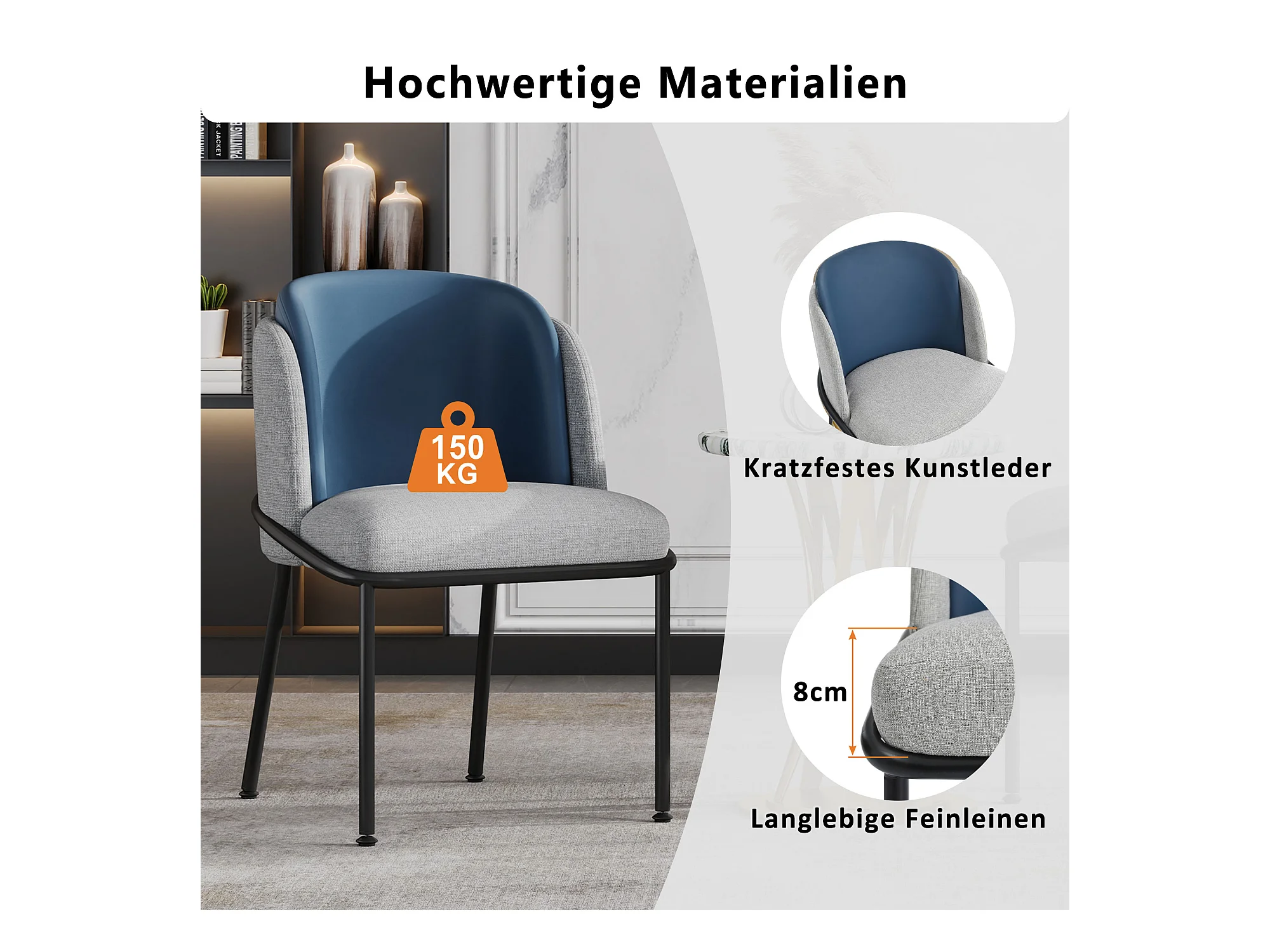 2 Chaises design contemporain à pieds inclinés, métal et bois, gris et marine (55x55x85cm)