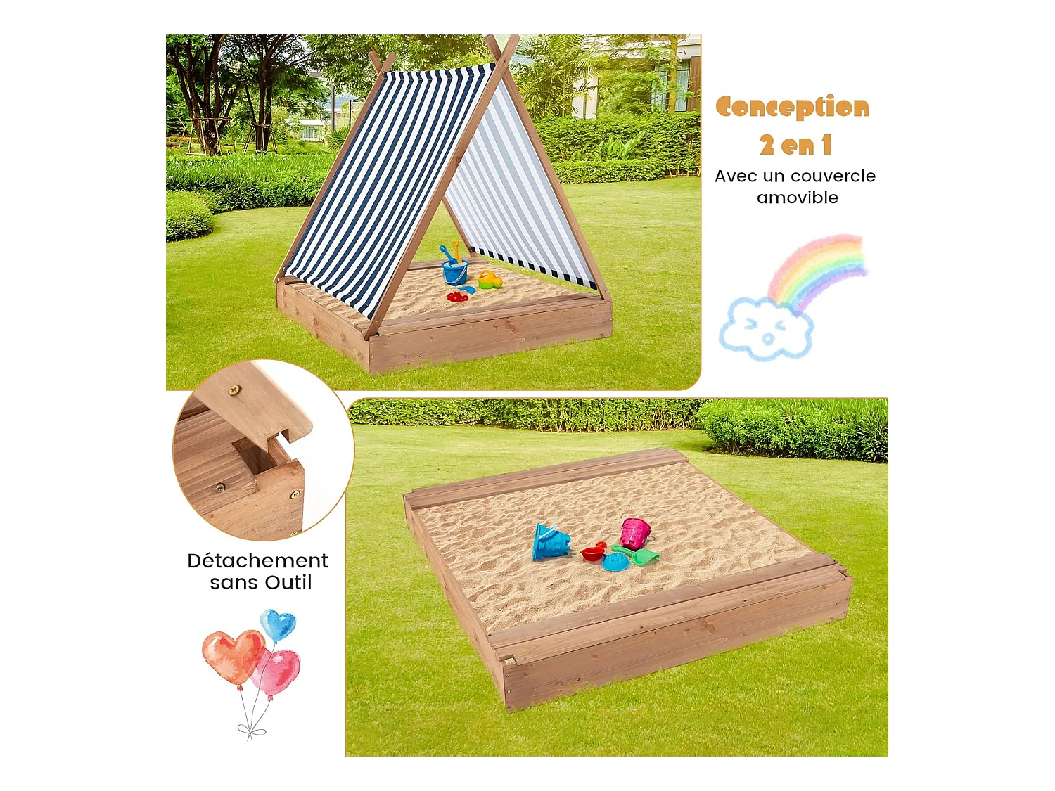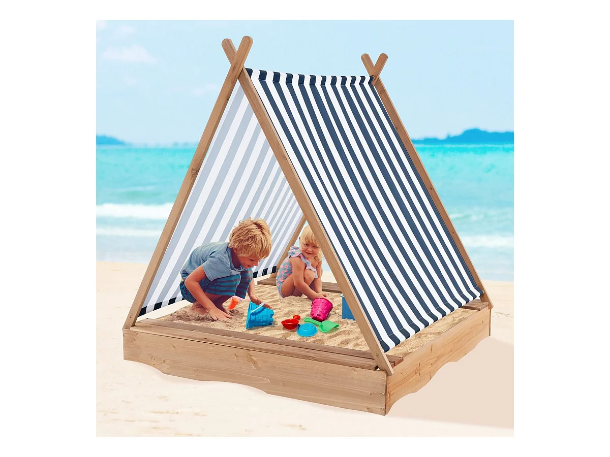 2 en 1 Bac à Sable en Bois Enfant avec Toit Amovible & 2 Bancs, Bac à Sable avec Conception sans Fond, Charge 100kg de Chaque Banc pour 1 an+, 124 x 123 x 134 cm