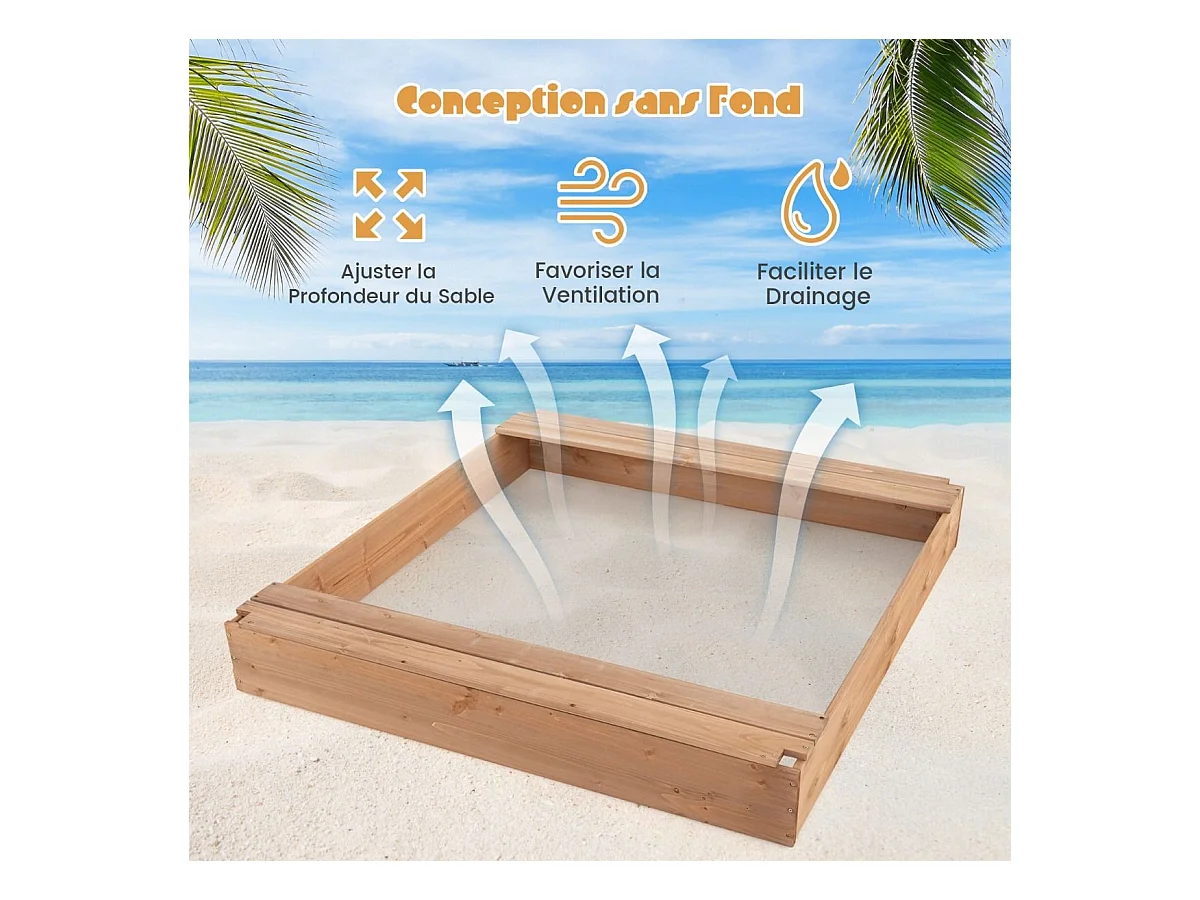 Bac à sable en bois avec couvercle et banc rabattables - 118 x 122 x H20 - Timbela M051-1