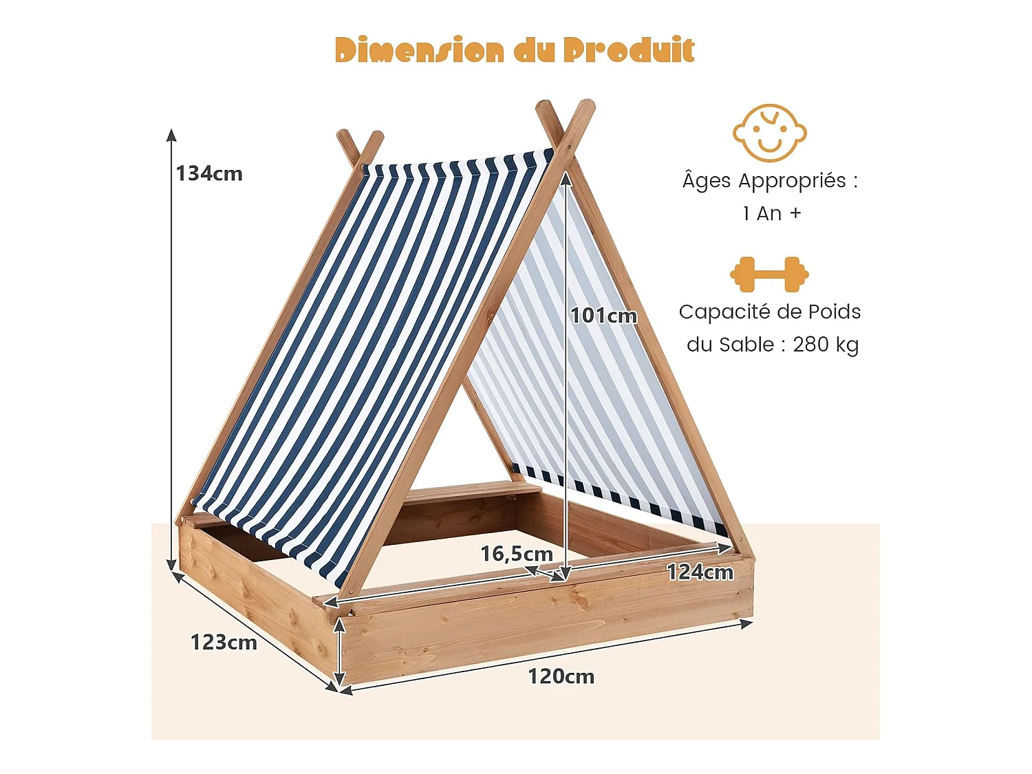 Bac à Sable en Bois de Sapin avec Toit Réglable & Inclinable, Bac à Sable Extérieur avec Conception sans Fond, Charge 90kg pour Enfant de 3 Ans+, 121 x 121 x 120 cm