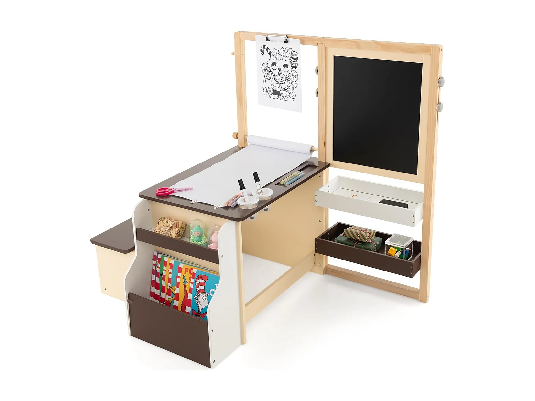 2 en 1 Bureau Enfants en Bois avec Banc & Etagères, Tableau Enfant Double Face Réglable avec Rouleau de Papier & 5 Craies, Table à Dessin Enfants de 3 Ans+, Charge 50kg (Café)