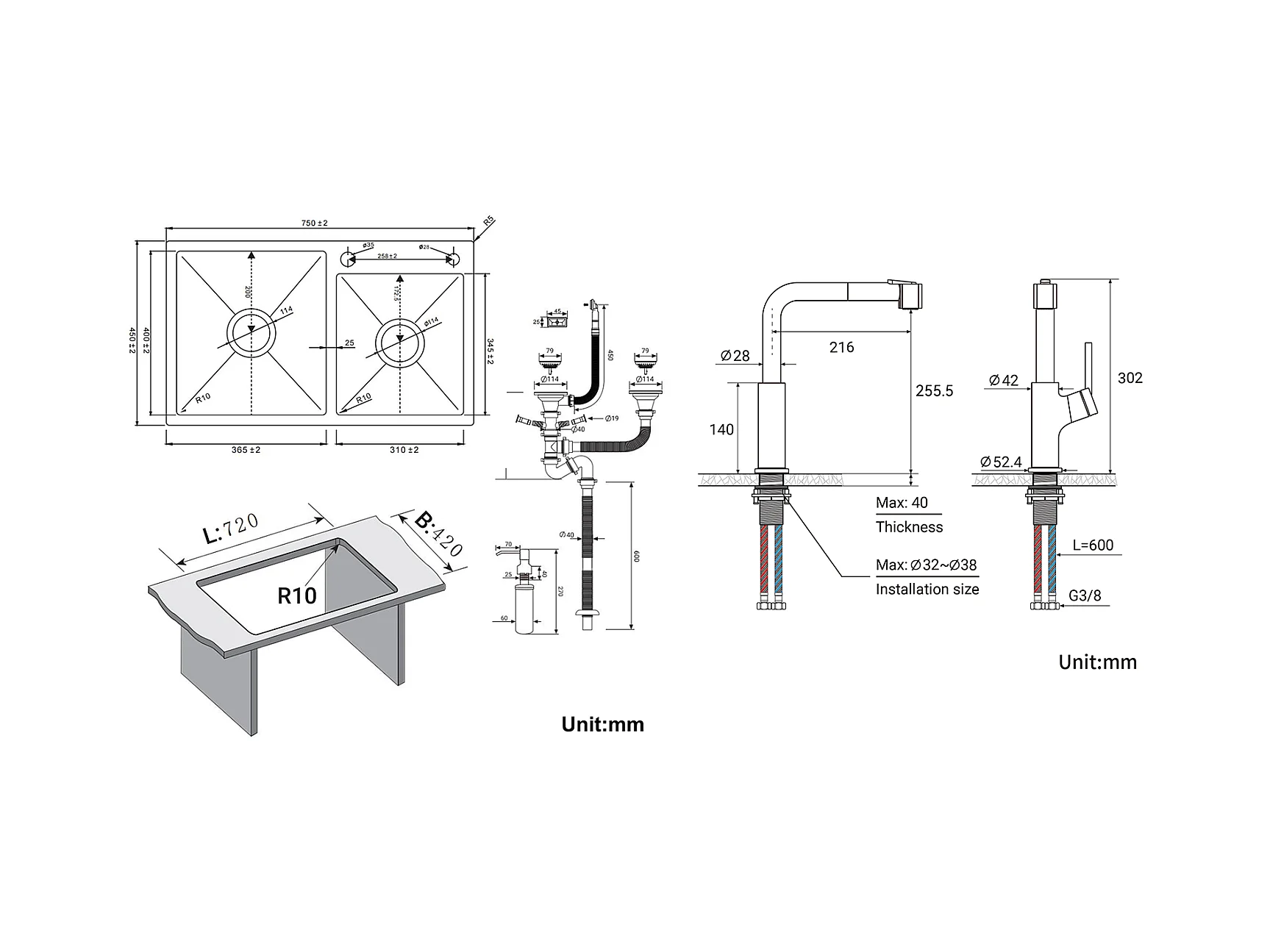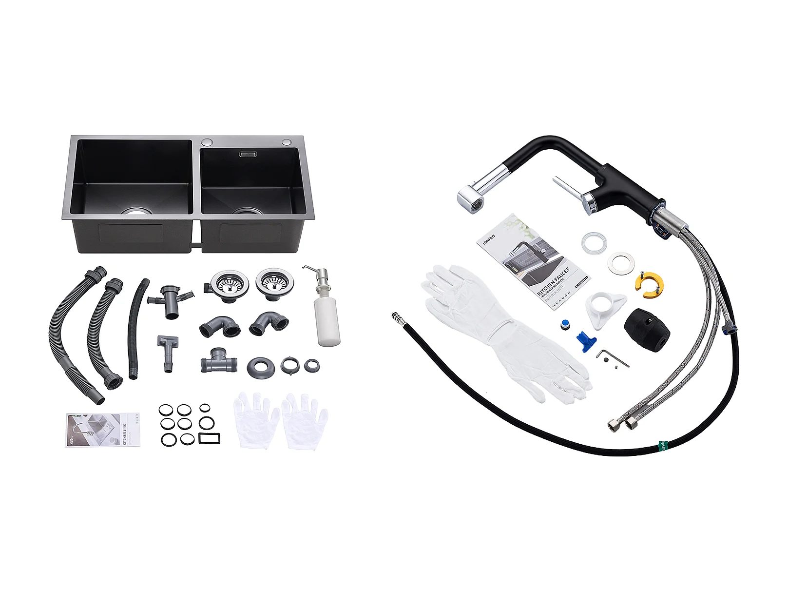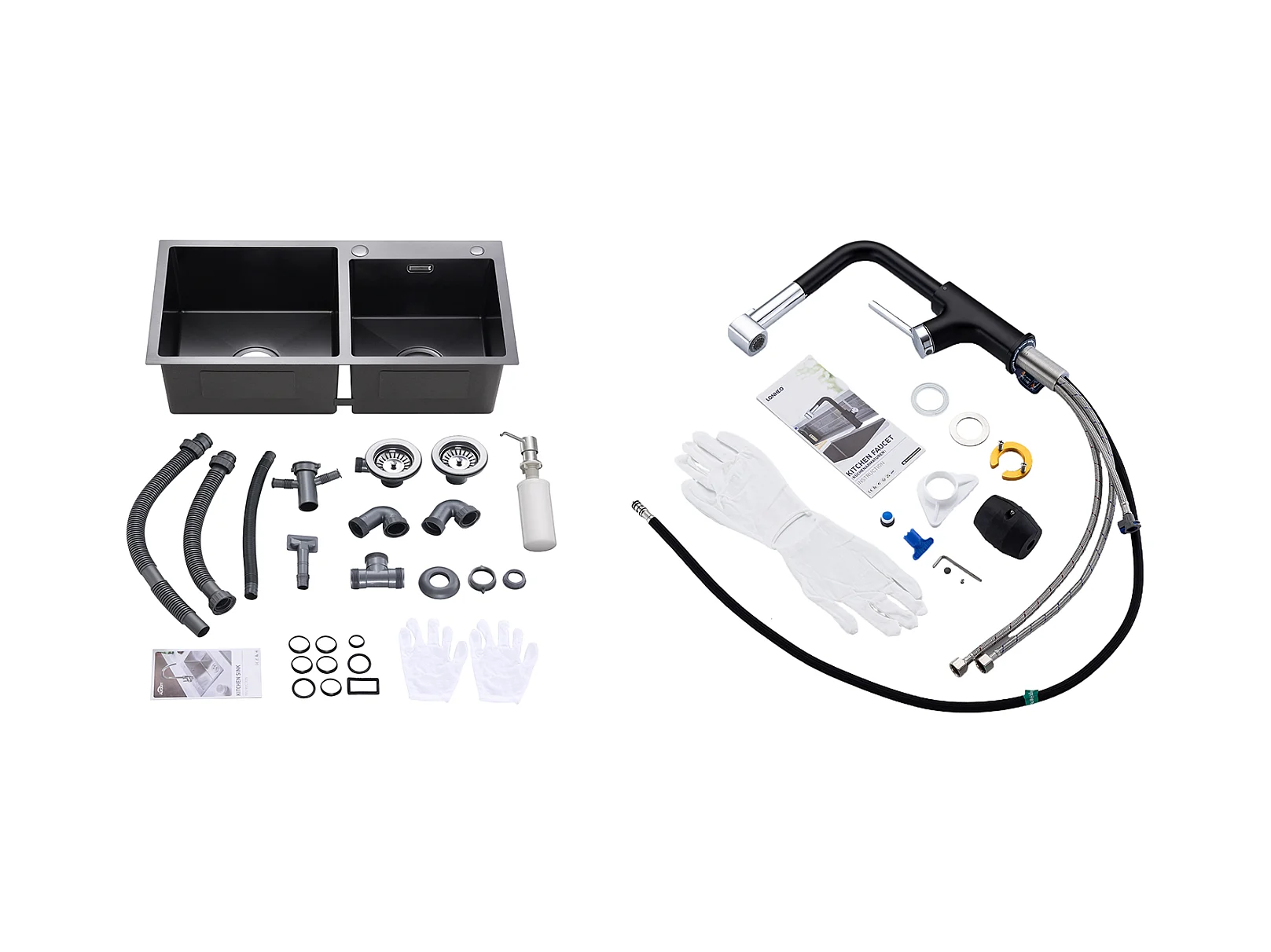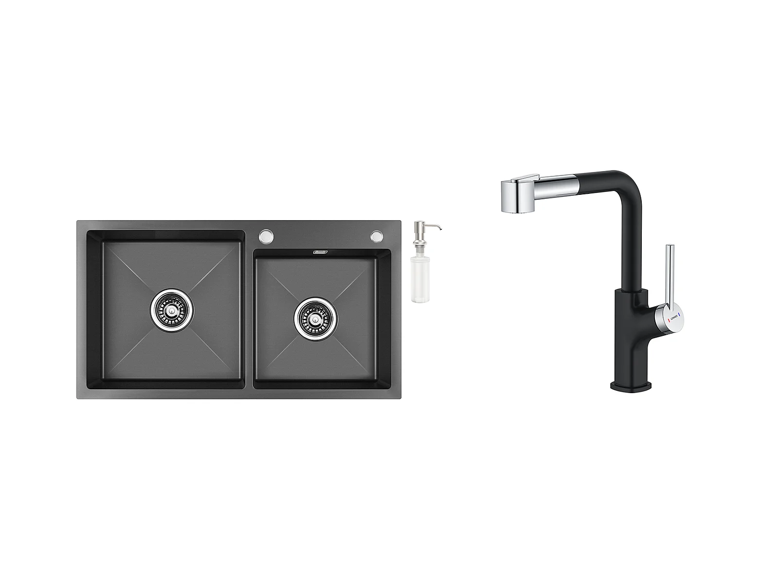 2 en 1 Évier Cuisine 2 Bac ,Noir,75x45x19cm,Encastré/ à Poser avec Distributeur Savon+ Robinet de Cuisine Inox Extractible Rotatif à 360 °
