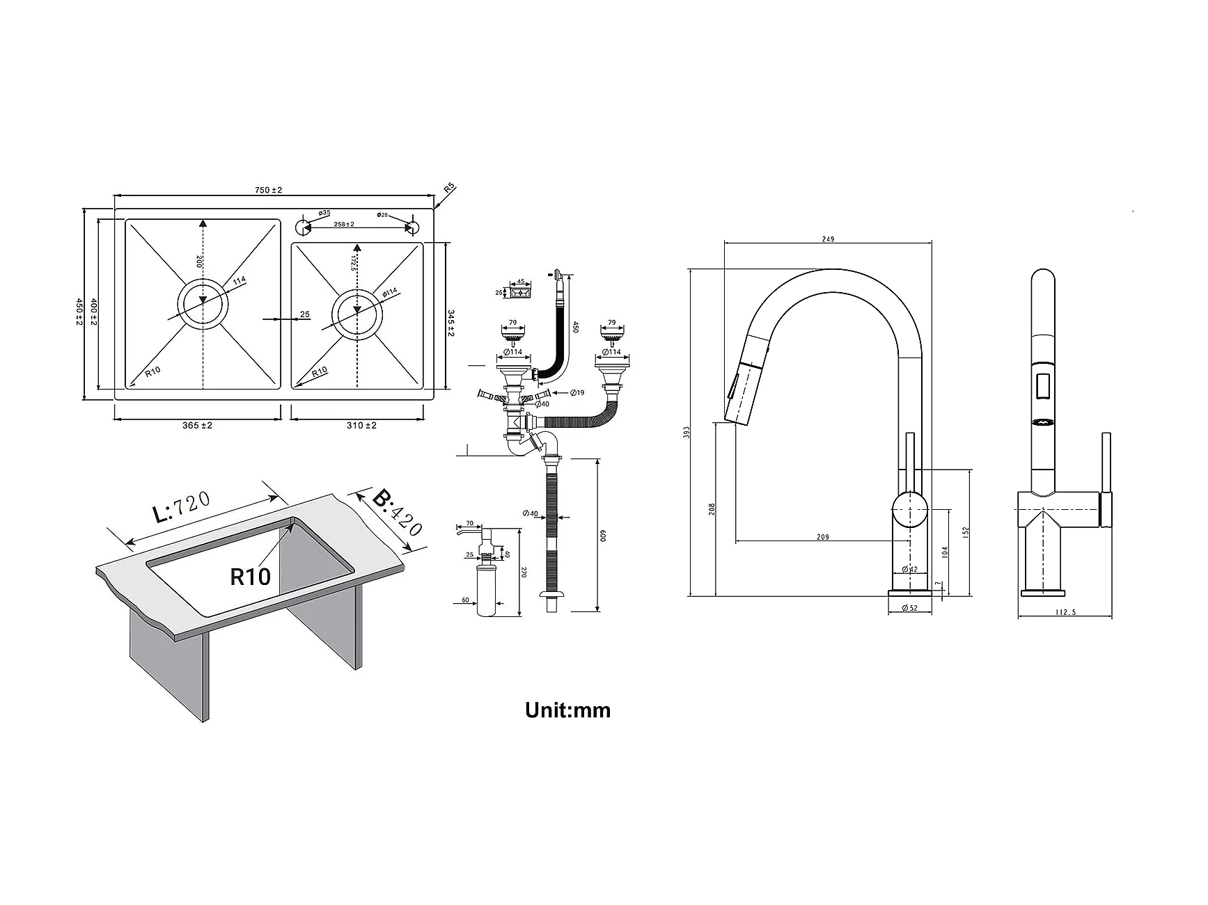 2 en 1 Évier de Cuisine 2 Bac 75x45x19cm,Encastré/ à Poser avec Distributeur de Savon+robinet de cuisine rétractable à deux fonctions, Noir