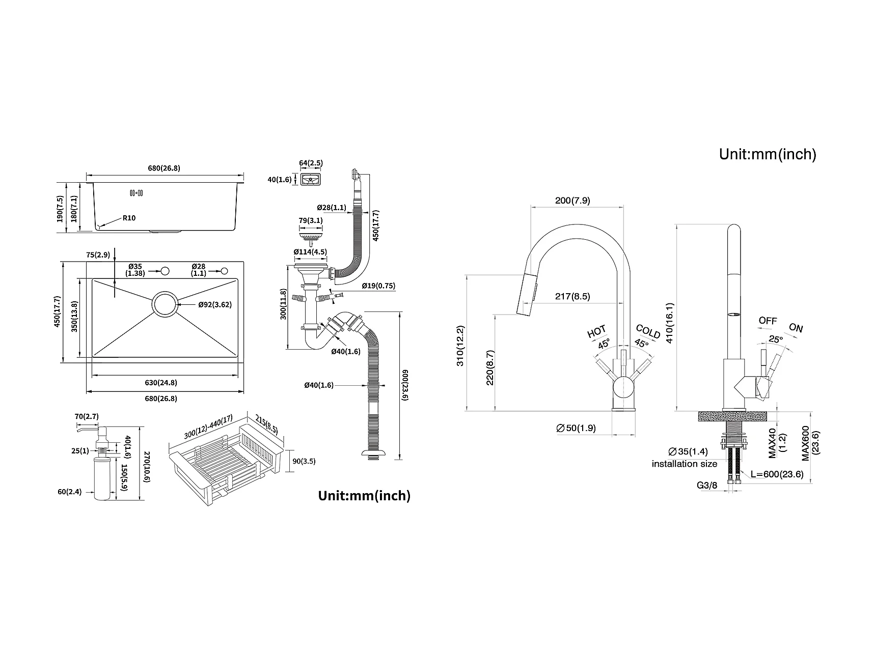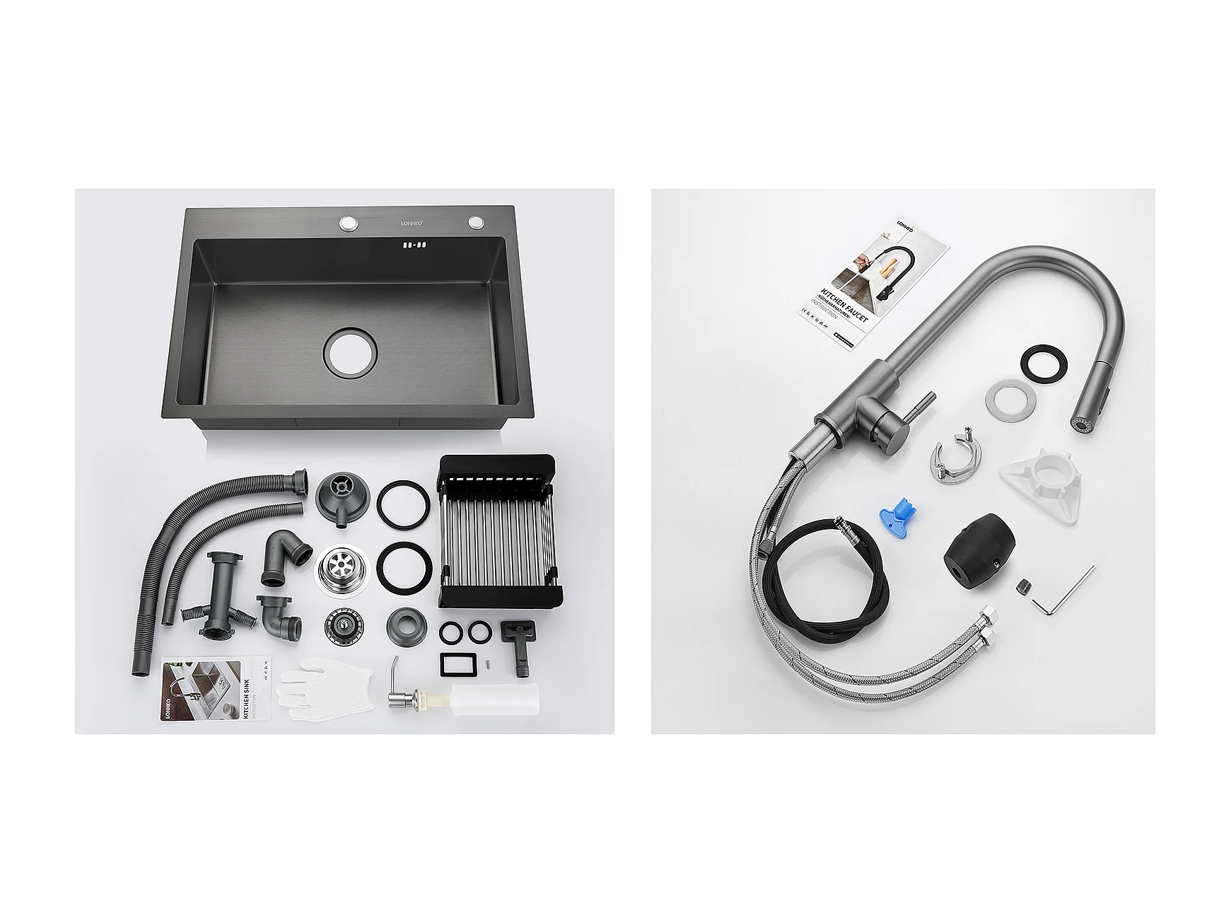2 en 1 Évier de Cuisine Noir 68x45x19CM avec Distrubuteur de savon et Égouttoir panier +Robinet Cuisine Douchette Extractible Gris Foncé