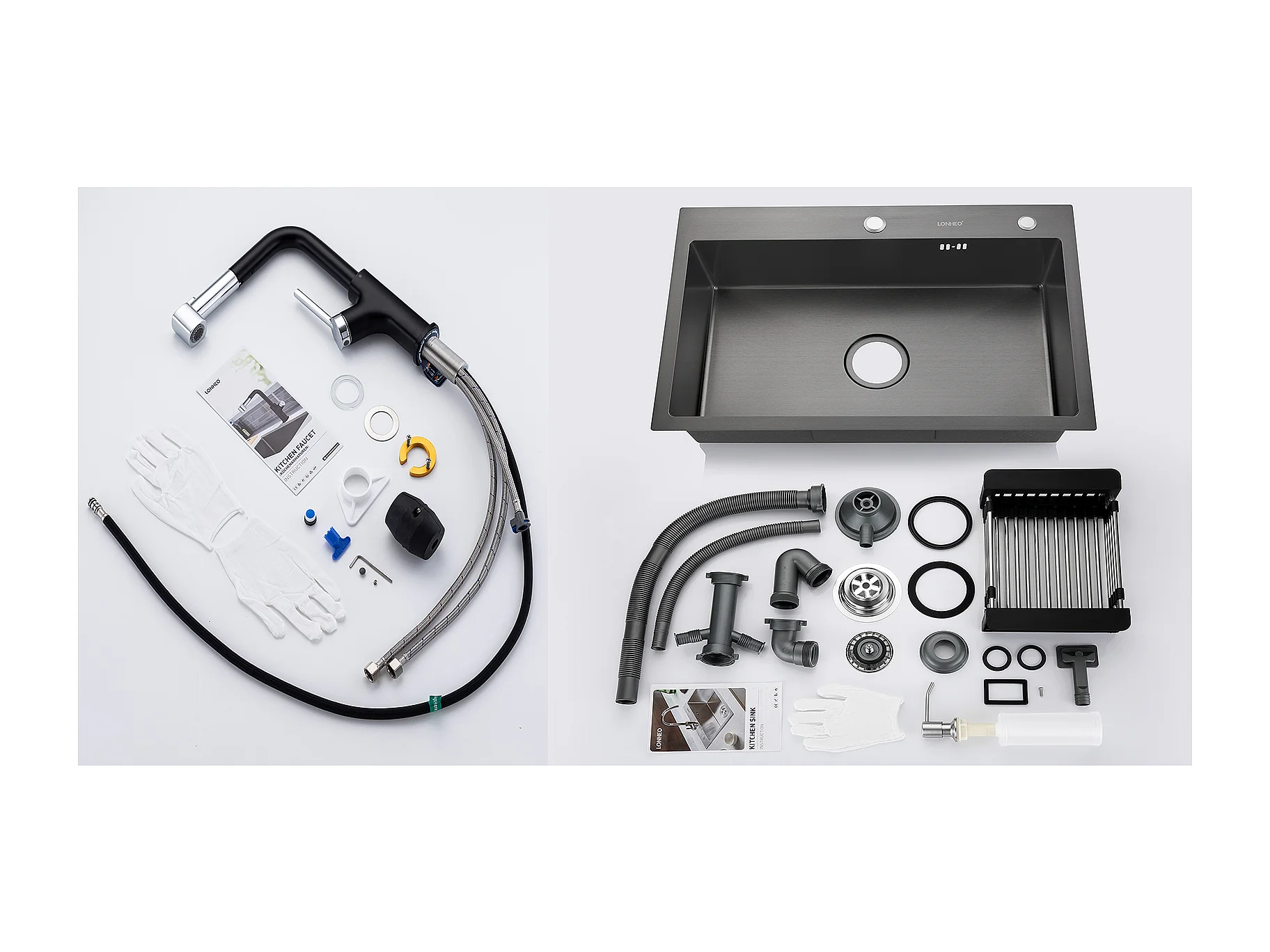 2 en 1 Évier de Cuisine Noir 68x45x19CM avec Distrubuteur de savon et Égouttoir panier + Robinet de Cuisine Inox Extractible Rotatif à 360 °