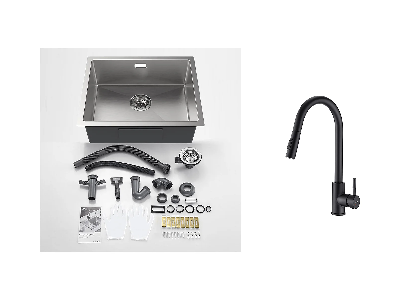 2 en1 Évier Cuisine 1 Bac 55*44*19CM, à Encastrer/Fleur/ Sous-Plan, Brossé+ Robinet Cuisine Noir, Extractible Rotatif à 360 °, 2 Fonctions