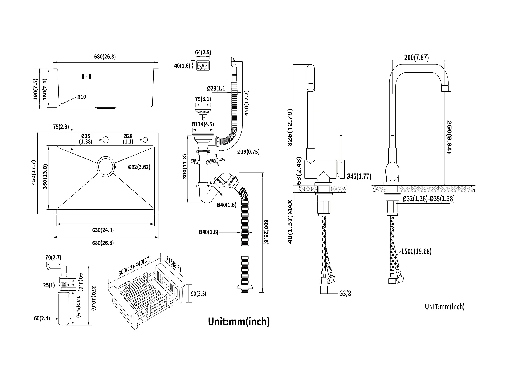 2 en1 Évier Cuisine Brossé 68x45x19CM avec Distrubuteur savon/ Égouttoir panier+Mitigeur Cuisine Rabattable Pivotant 360°  Eau froid Chaud
