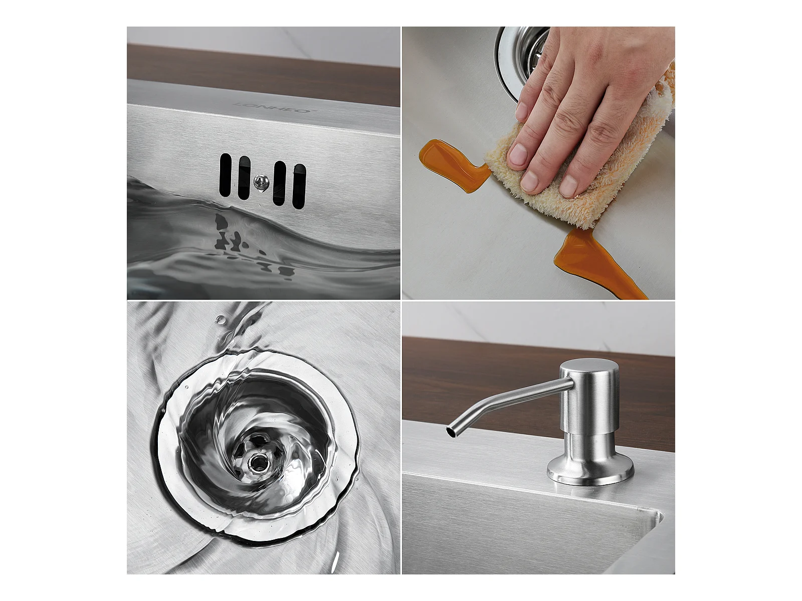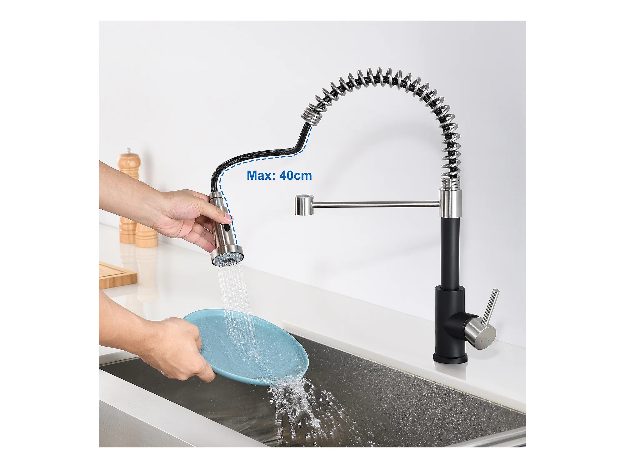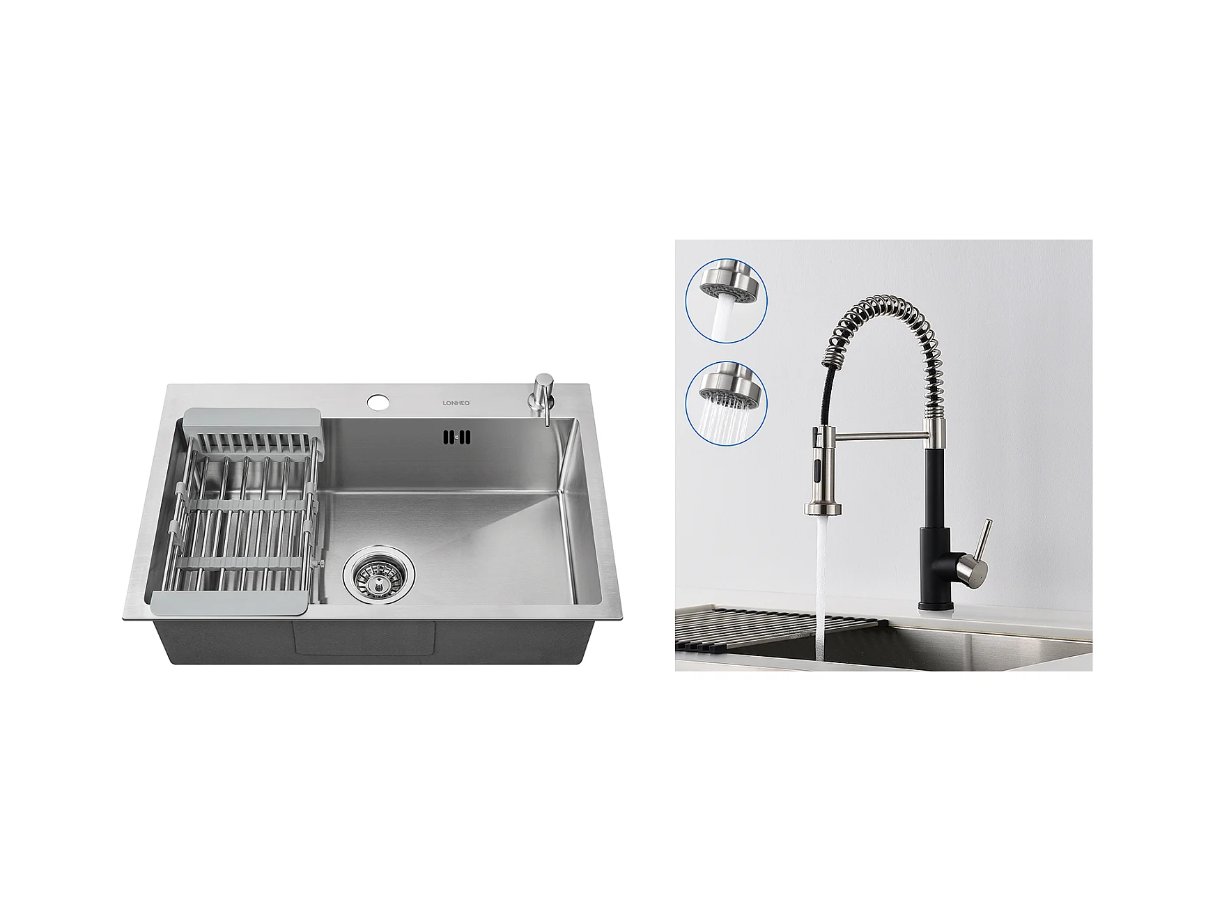 2 en1 Évier Cuisine Brossé 68x45x19CM avec Distrubuteur savon Égouttoir Panier+Robinet Cuisine Ressort avec Douchette Extensible,2 Modes,Noir