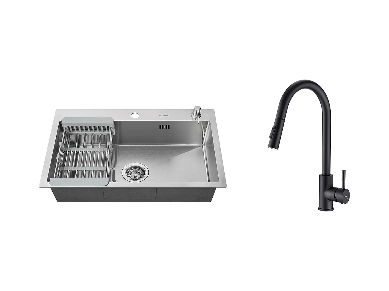 LONHEO MAX 2 en1 Évier Cuisine Brossé 68x45x19CM avec Distrubuteur savon Égouttoir Panier
