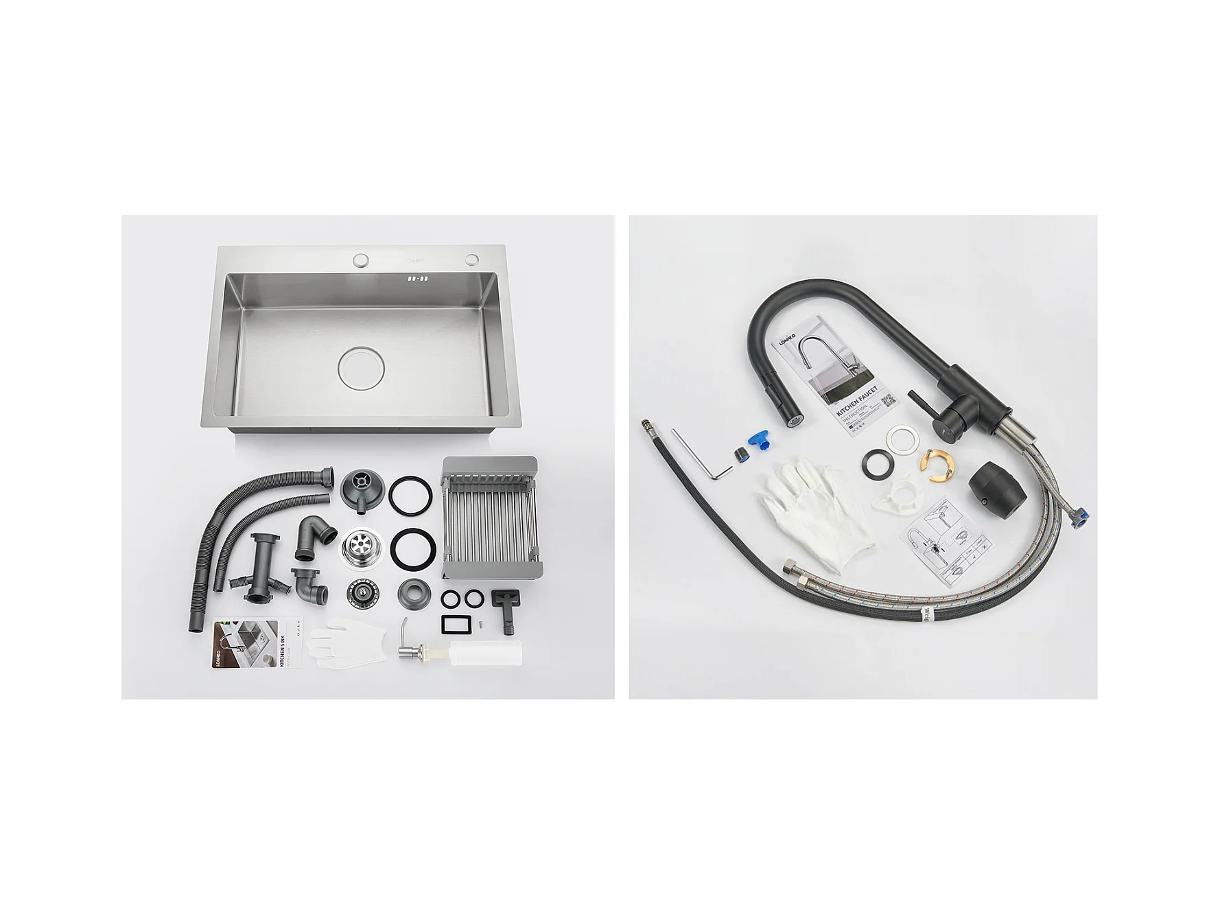 2 en1 Évier Cuisine Brossé 68x45x19CM avec Distrubuteur savon Égouttoir Panier+ Robinet de Cuisine Noir avec Douchette Extractible