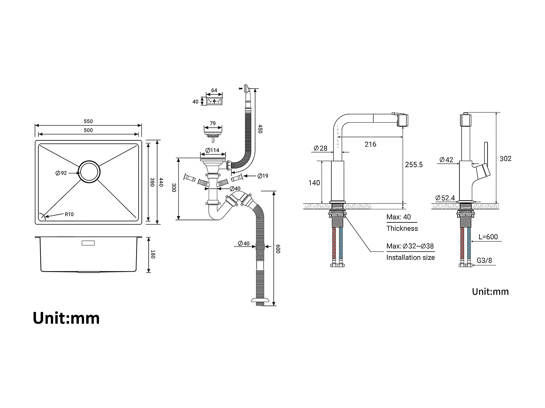 2 en1 Évier de Cuisine 1 Bac 55*44*19CM, à Encastrer/Fleur/ Sous-Plan, Brossé +robinet de cuisine rétractable à deux fonctions, chromé