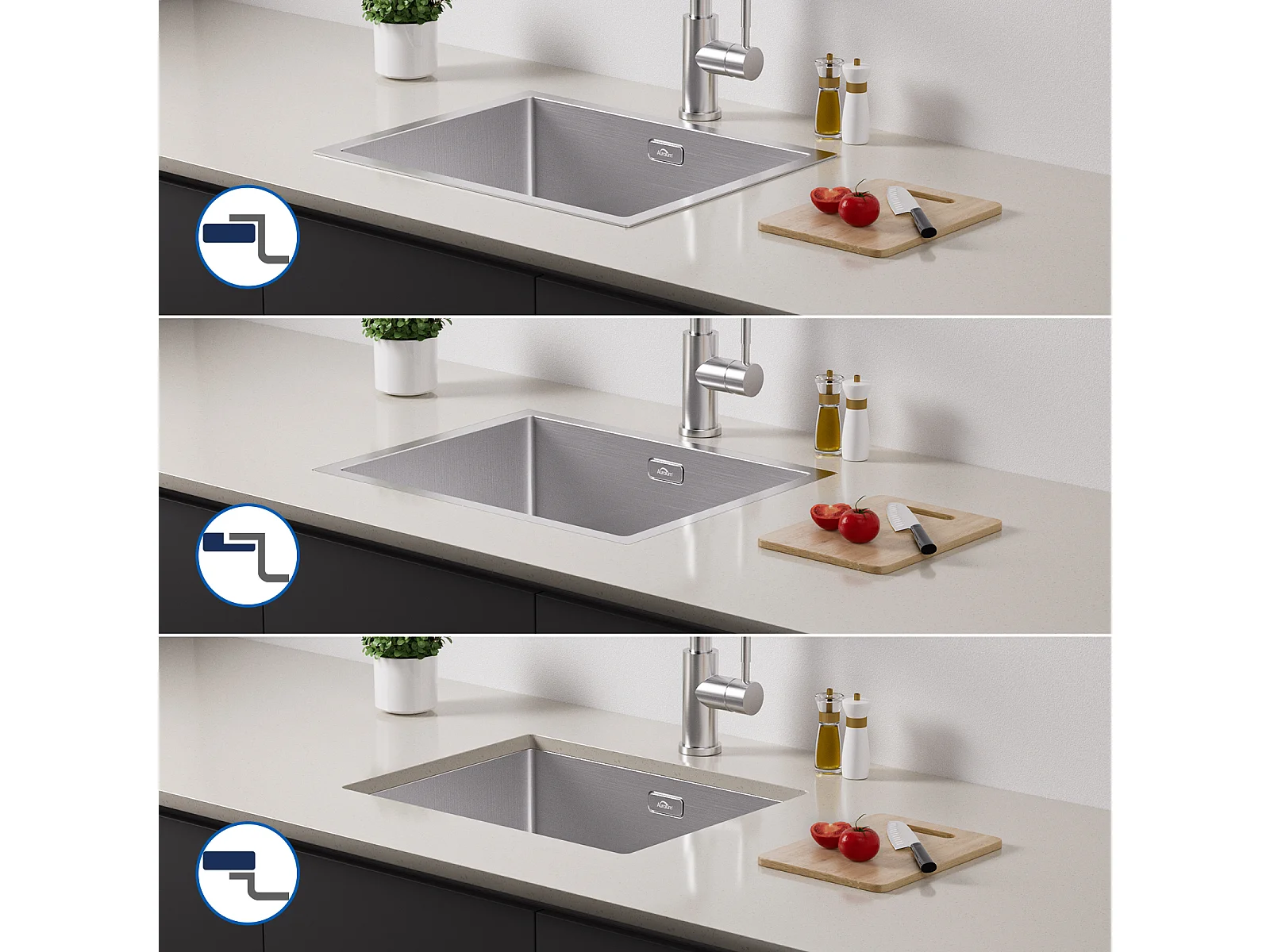 2 en1 Évier de Cuisine 1 Bac 55*44*19CM, à Encastrer/Fleur/ Sous-Plan, Brossé+Robinet de Cuisine Pivotant à 360° Eau Froide /Chaude,Chromé