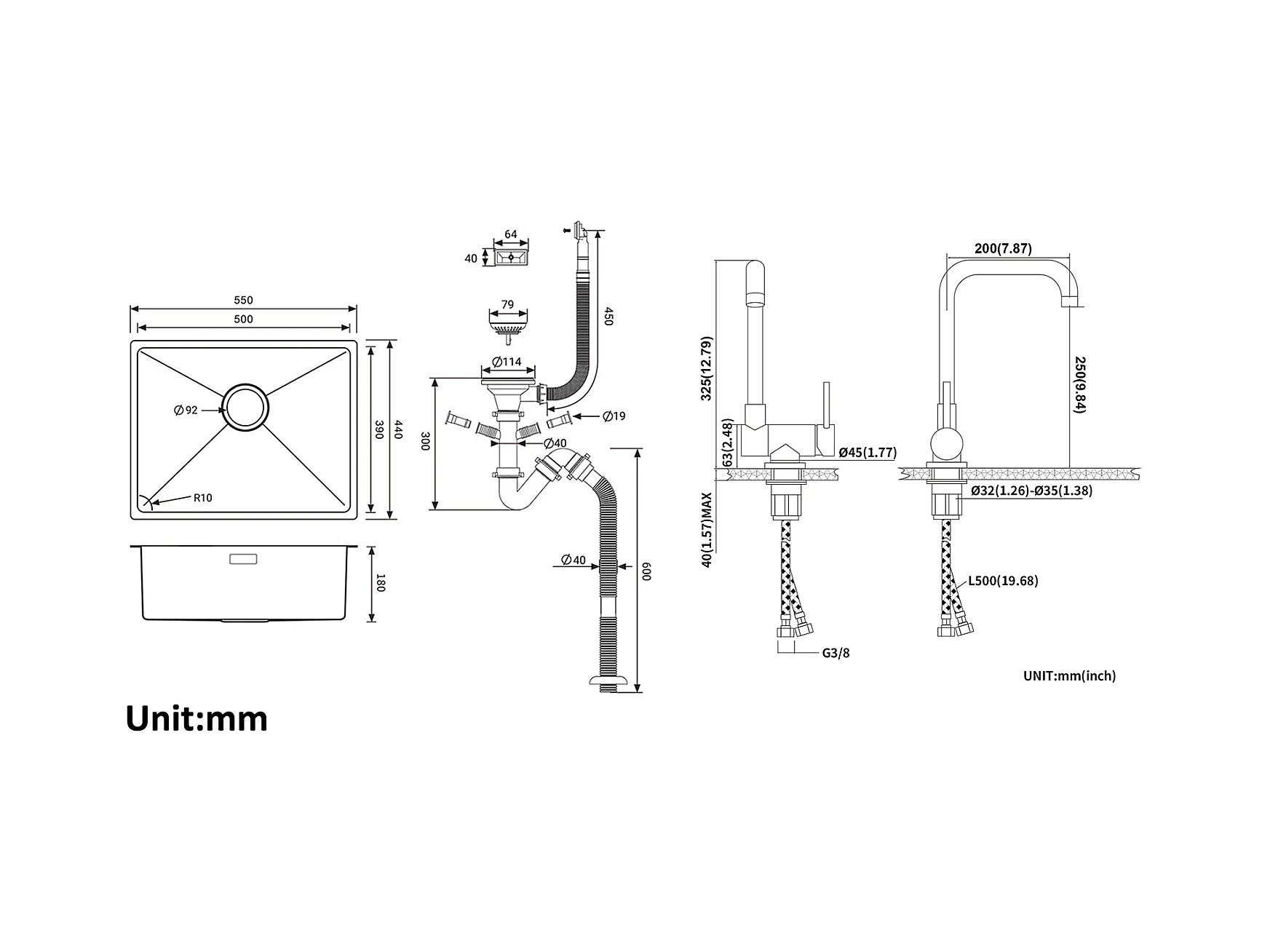 2 en1 Évier de Cuisine 1 Bac 55*44*19CM, à Encastrer/Fleur/ Sous-Plan, Noir+Robinet de Cuisine Pivotant à 360° Eau Froide /Chaude,Chromé