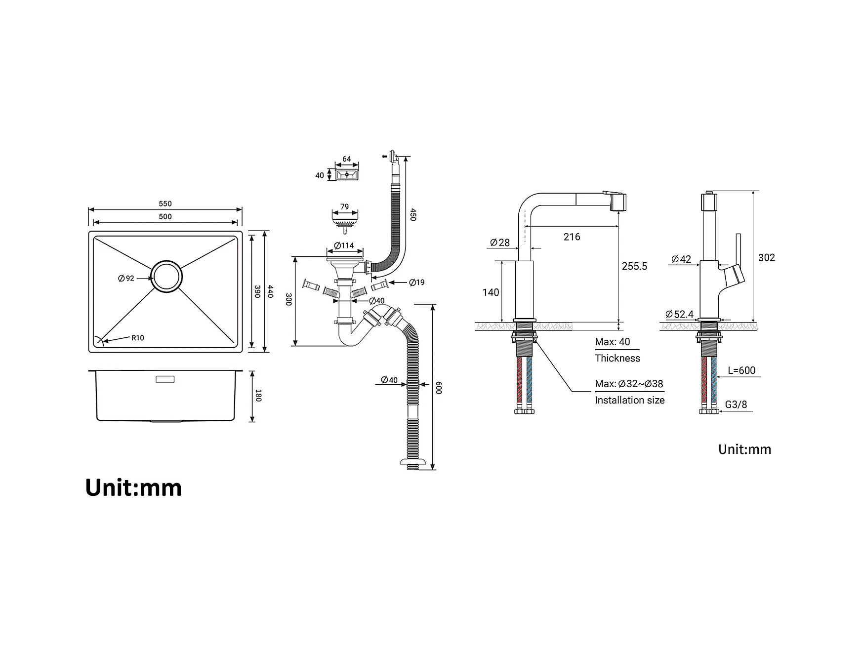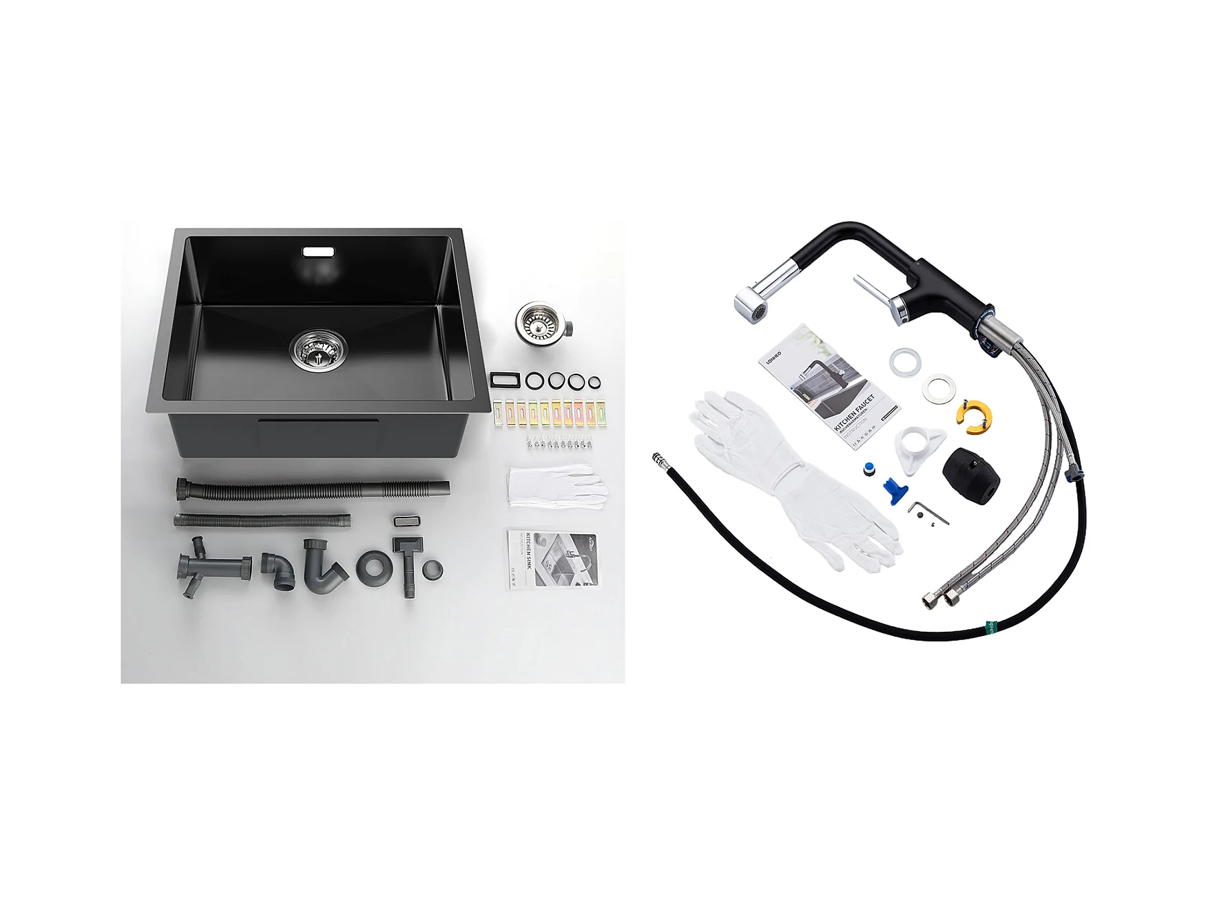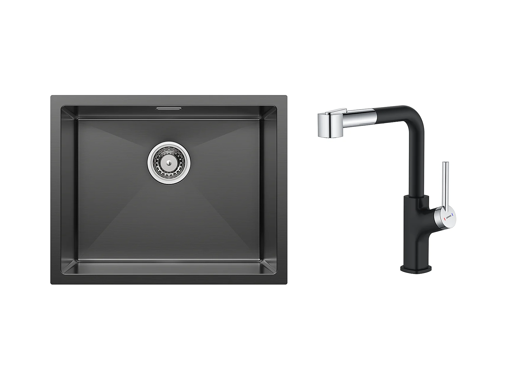2 en1 Évier de Cuisine 1 Bac 55*44*19CM, à Encastrer/Fleur/ Sous-Plan, Noir + Robinet de Cuisine Inox Extractible Rotatif à 360 °