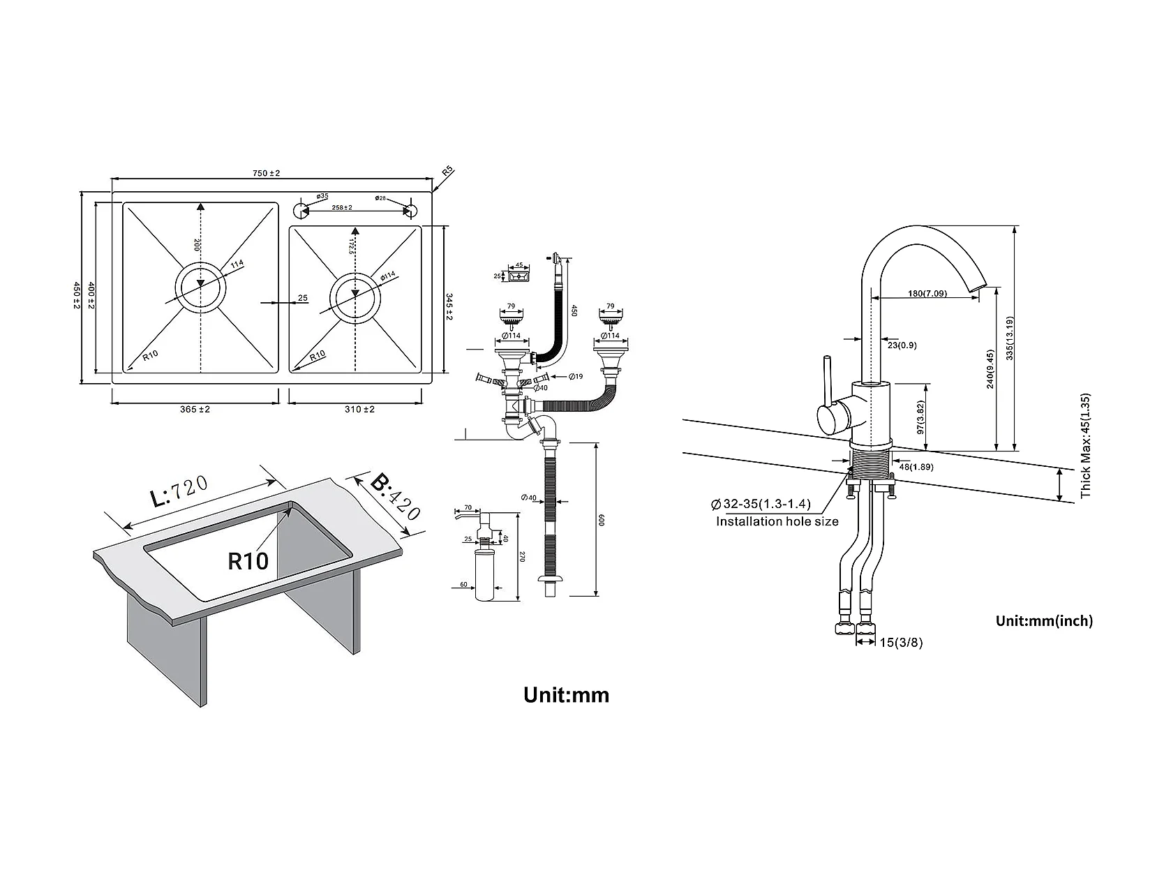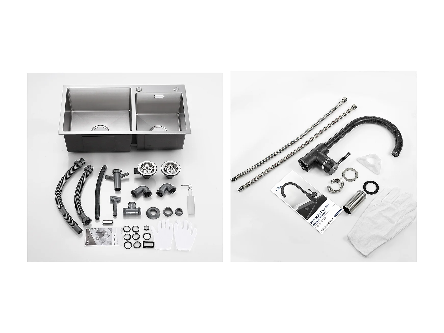 2en1 Évier Cuisine 2 Bac 75x45x19cm,Encastré/ à Poser avec Distributeur Savon+Robinet Cuisine Rotatif 360°, Noir avec points blancs