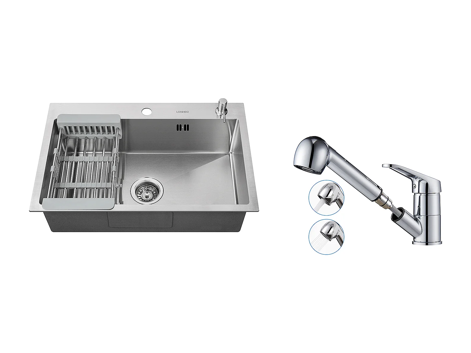 2en1 Évier Cuisine Brossé 68x45x19CM avec Distrubuteur savon Égouttoir Panier+Mitigeur Cuisine avec Douchette Extractible Rotatif 360°,Chromé