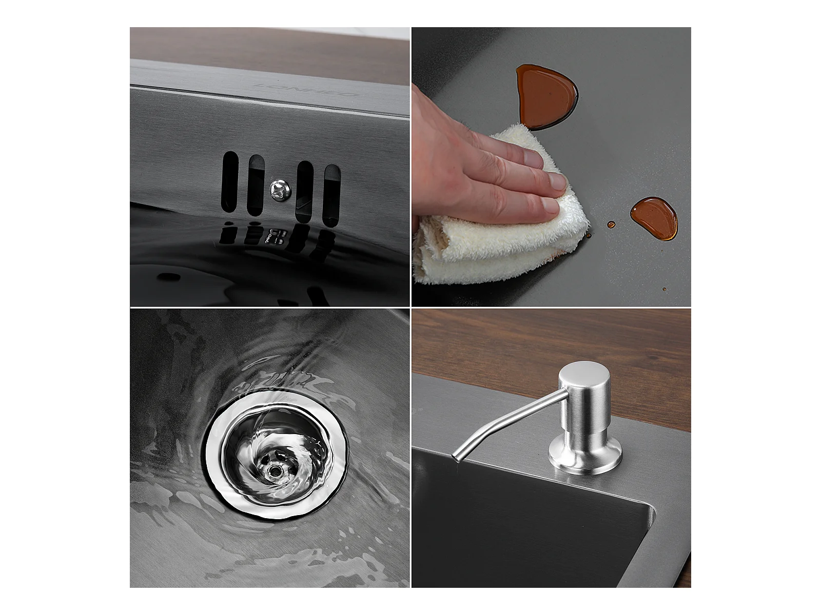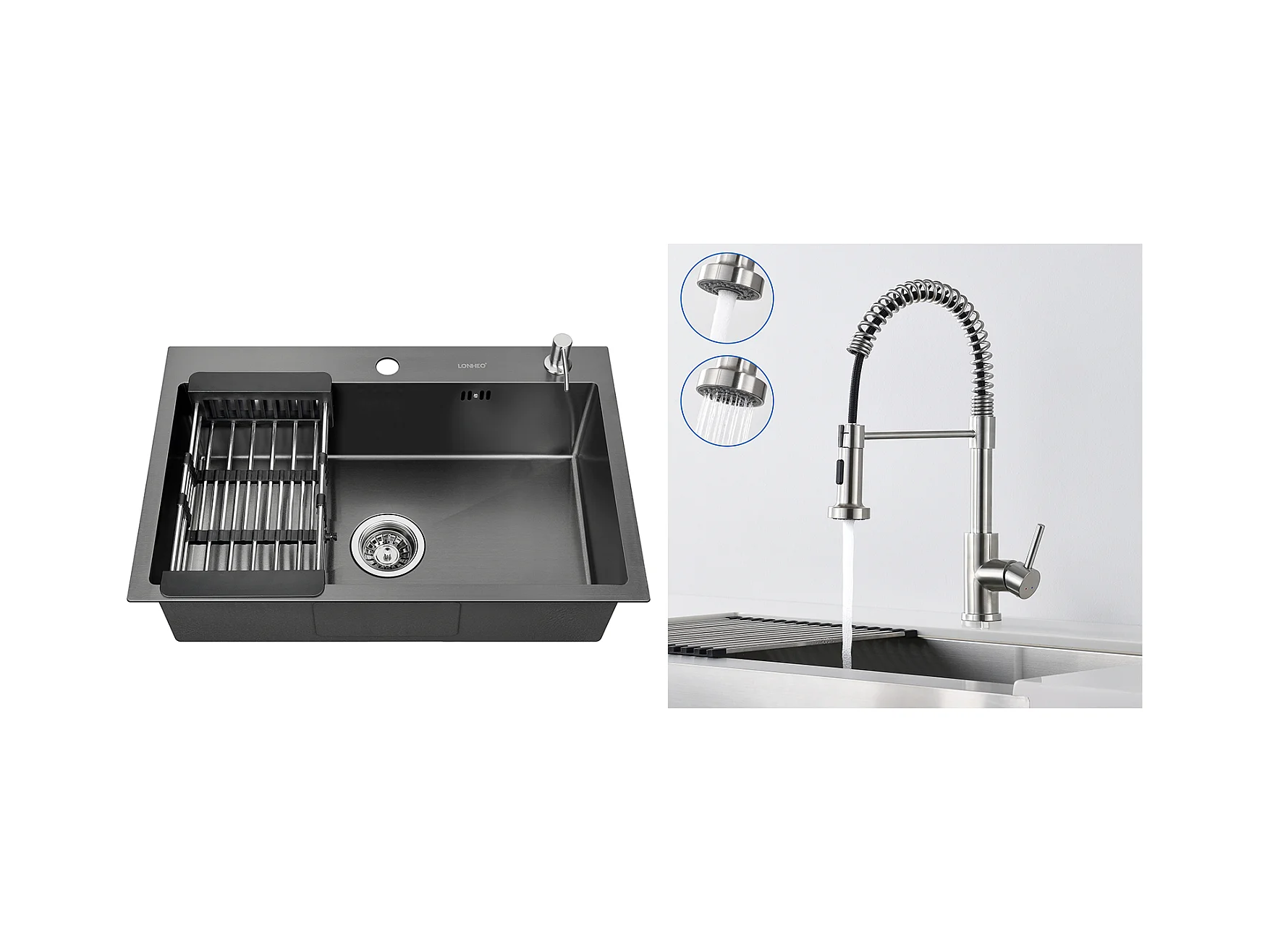 Lonheo Max Évier de Cuisine Noir 68x45x19CM avec Distrubuteur de savon et Égouttoir panier +Mitigeur Cuisine en Acier Inox 304 Rabattable Pivotant
