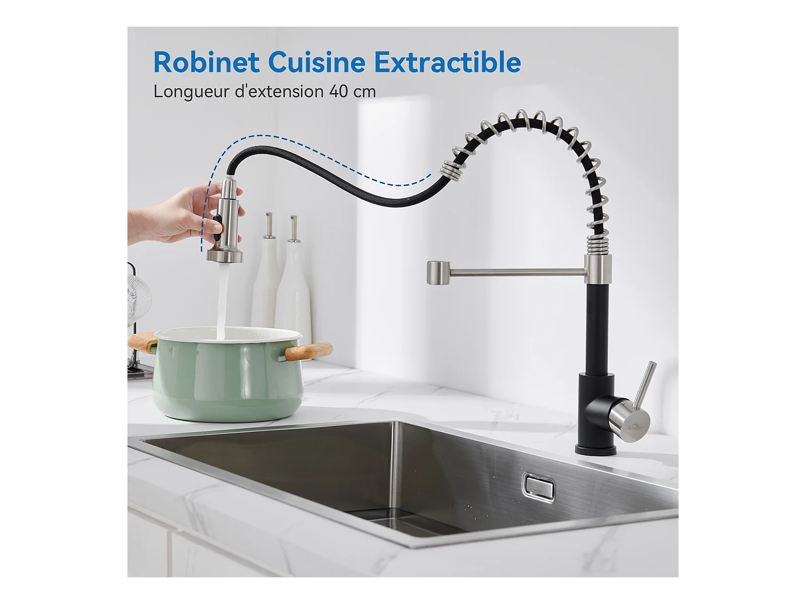 Mitigeur de Cuisine Noir AuraLum Max pivotant 360° avec Tête Pulvérisation Rétractable,Robinet Cuisine à ressort,Inoxydable, Double Mode,EU Modèle