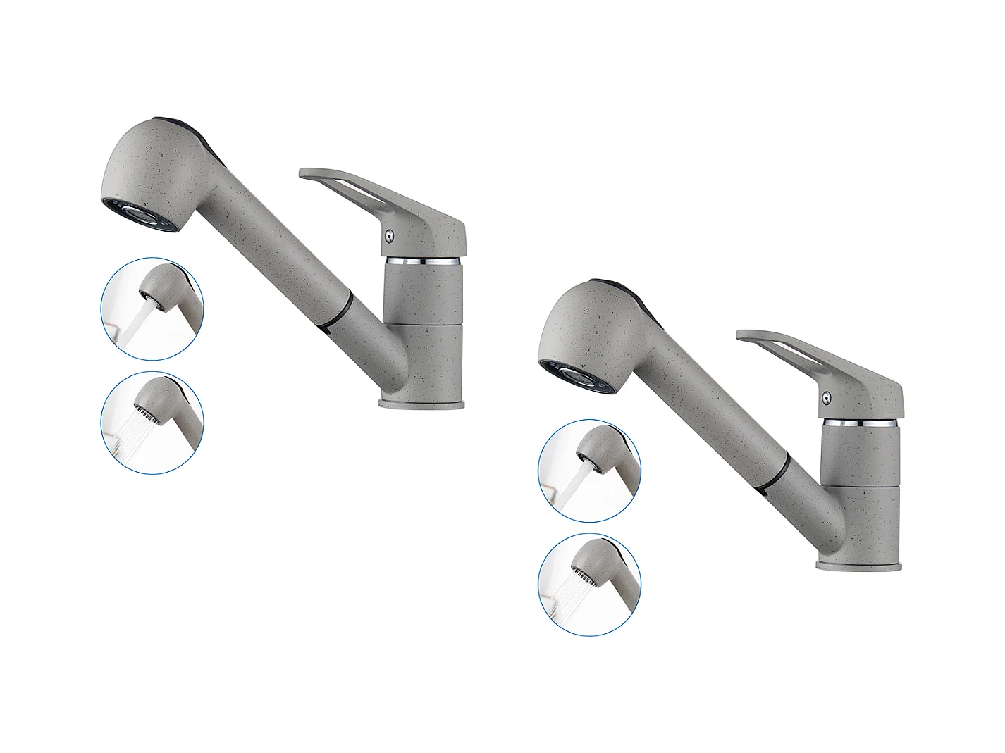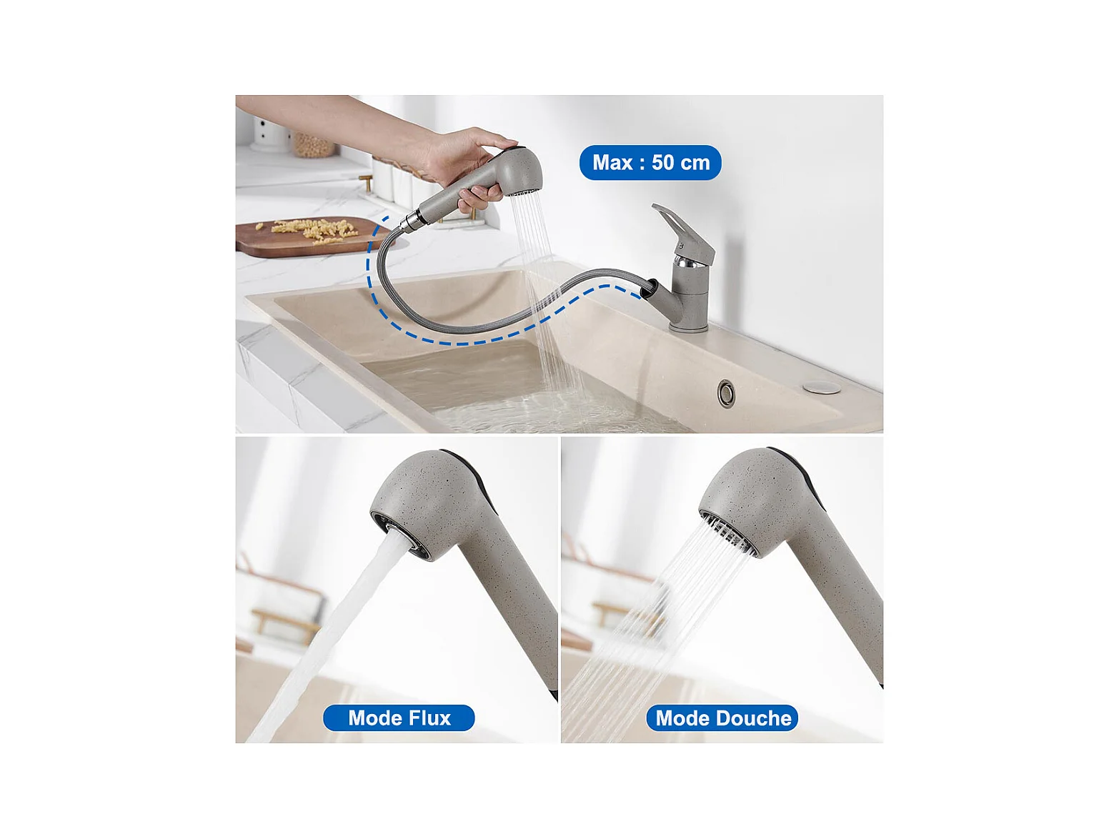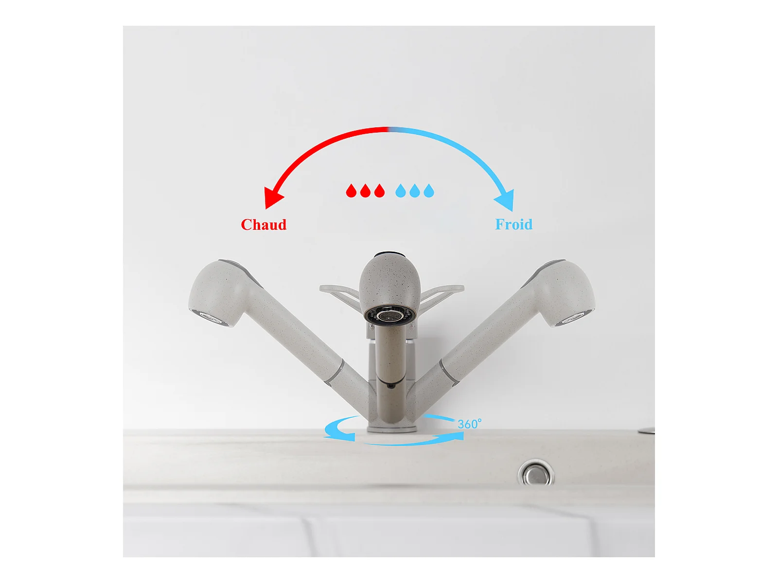 Mitigeur Cuisine Douchette, Robinet Cuisine Douchette Extractible avec 2 Modes de Pulvérisation, Rotatif à 360°, Froid & Chaud, Gris Granit