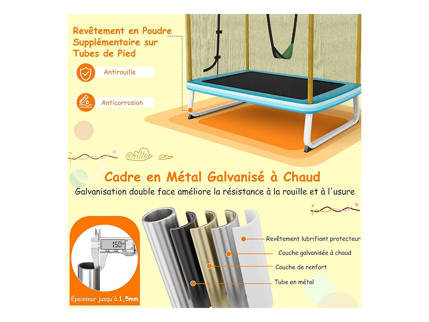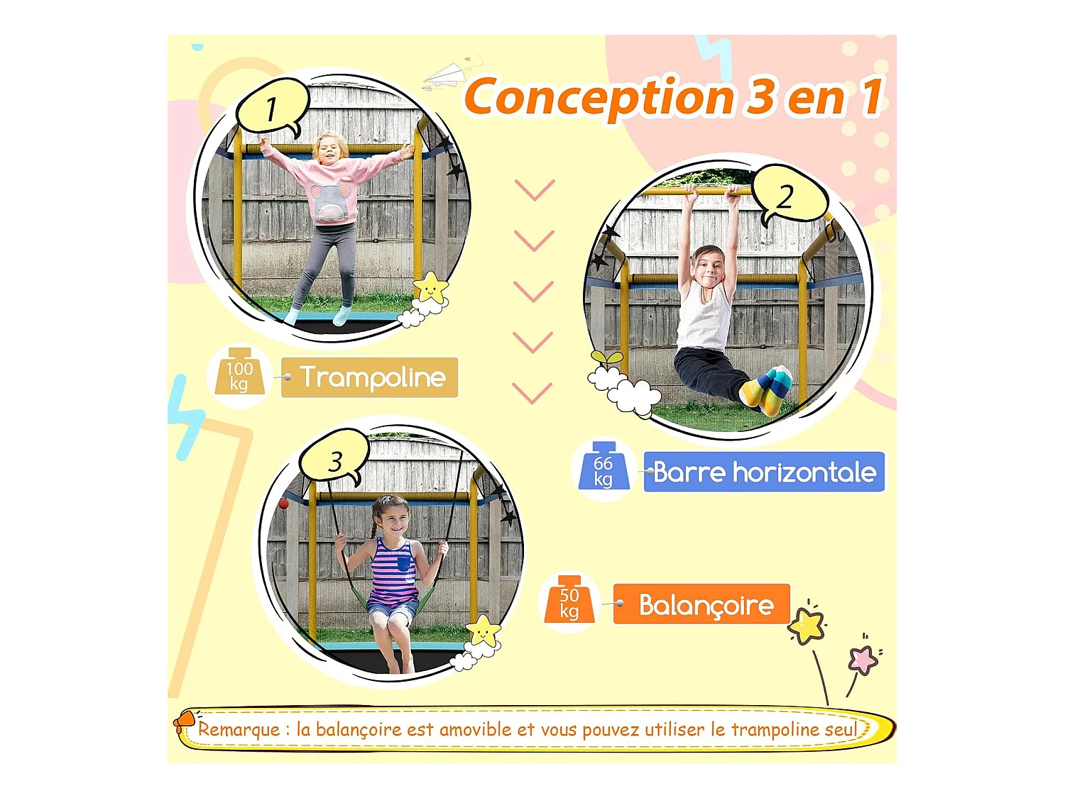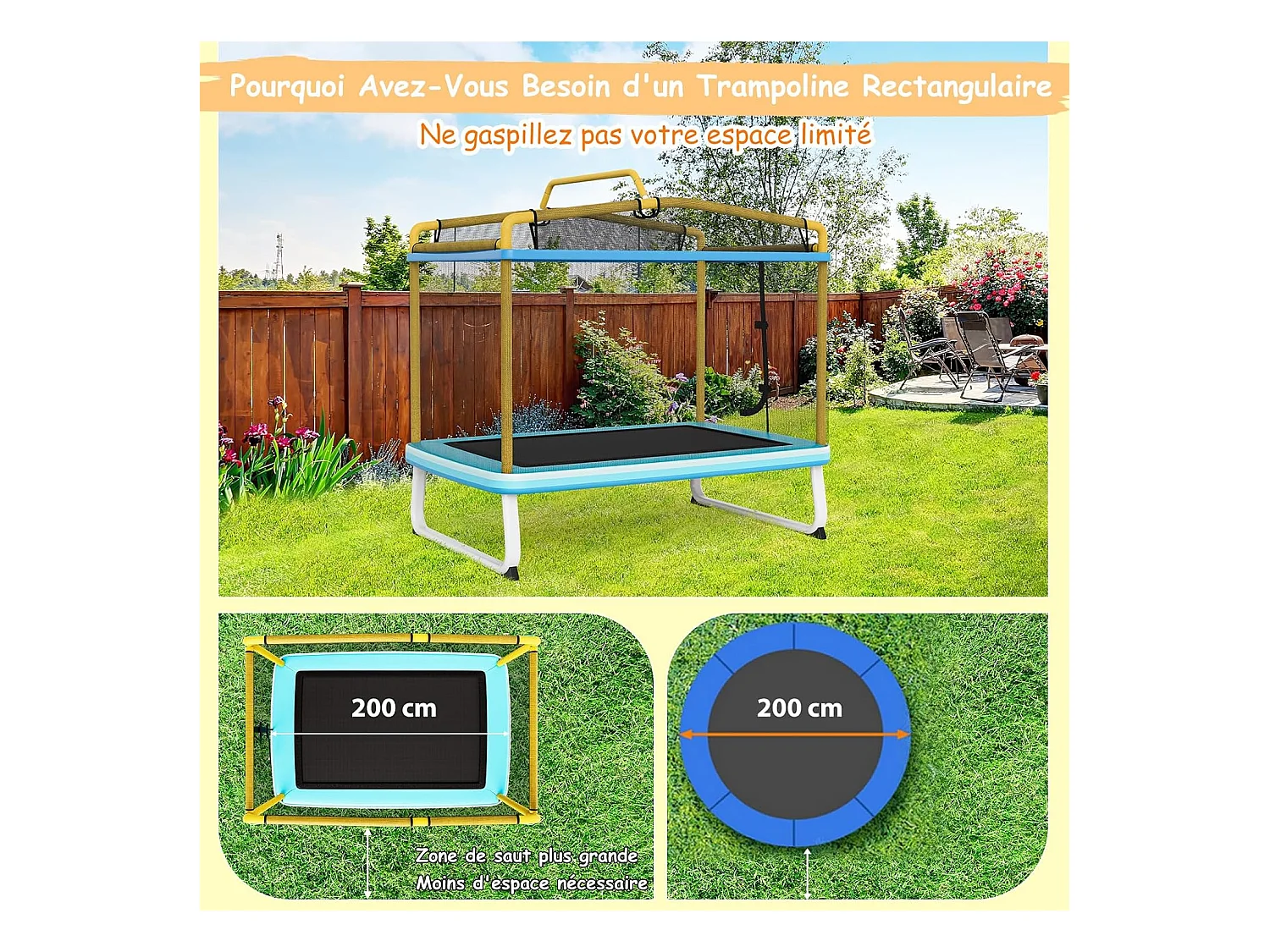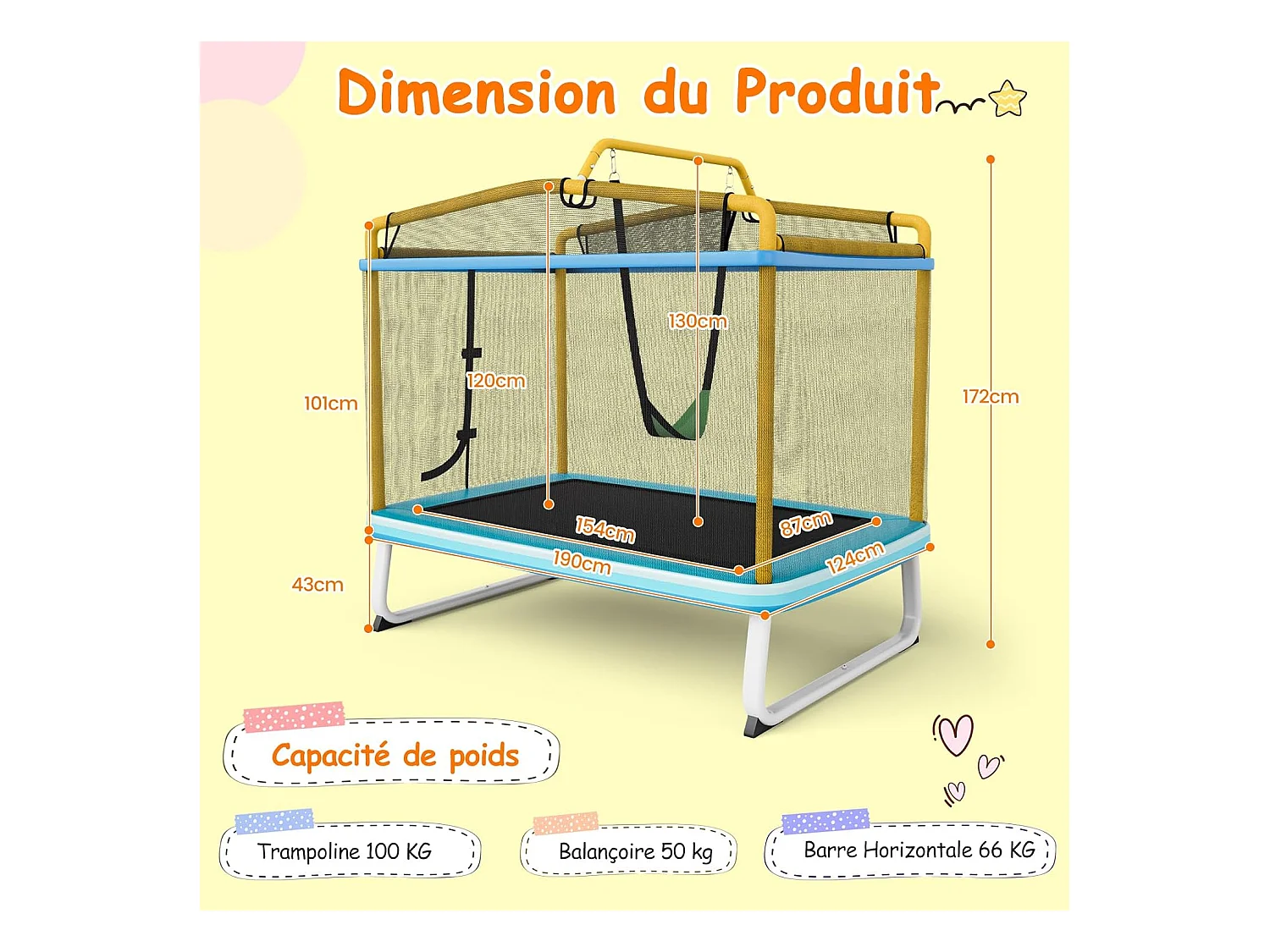 3 en 1 Trampoline Extérieur Enfants Rectangulair (190x124cm) avec Balançoire & Barre Horizontale, Trampoline de Jardin avec Filet de Sécurité, Charge Max 110kg, Jaune